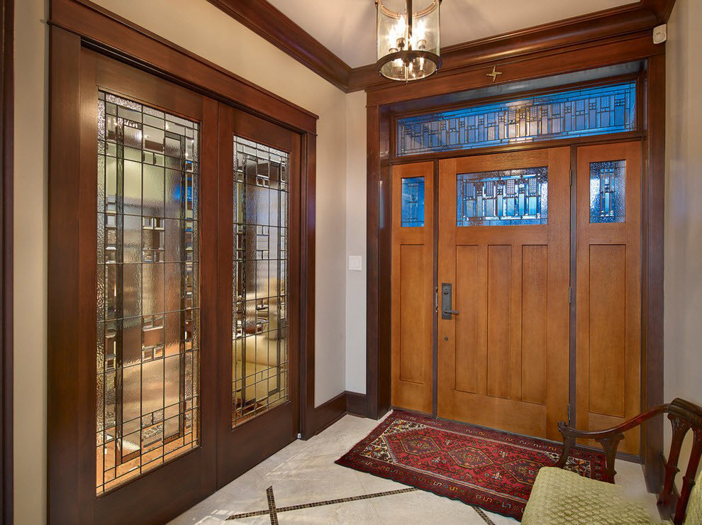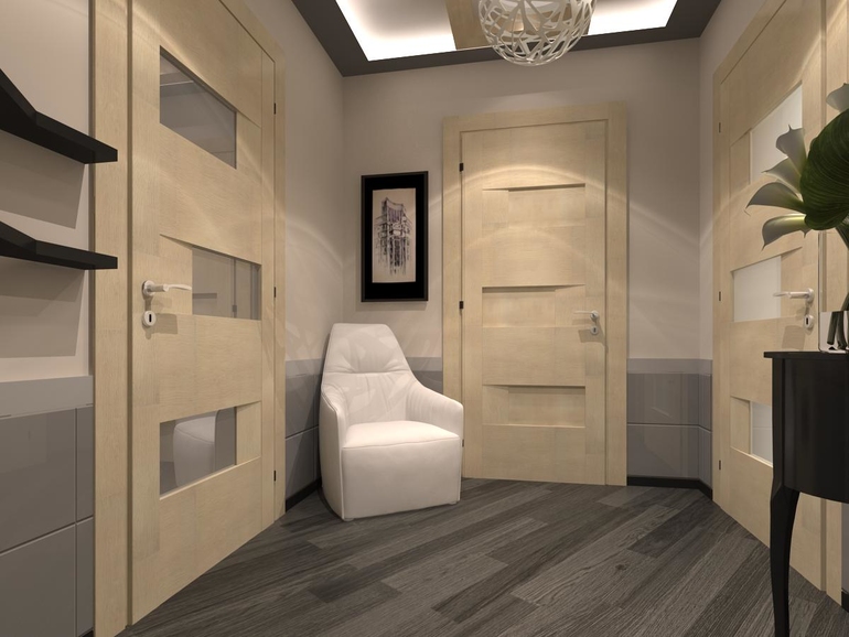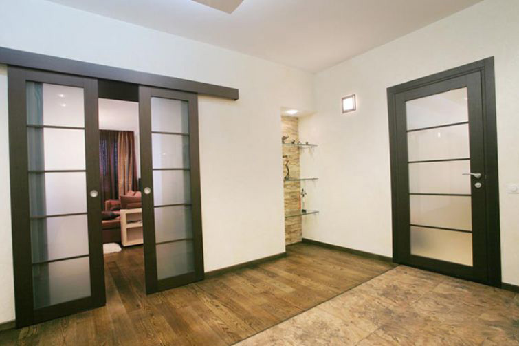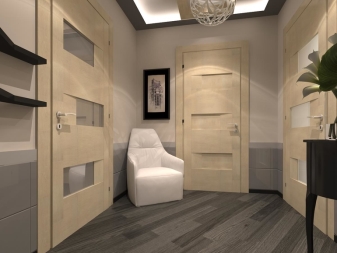 In den meisten Fällen hat die Anordnung der Räume separaten Korridor eine Reihe von Türen zu benachbarten Räumen. Hier besteht die Hauptaufgabe darin, das Konzept eines einzelnen separaten Raums zu bewahren. Zu diesem Zweck müssen alle vorhandenen Türen und Böschungen aus demselben Material mit dem gleichen Muster und der gleichen Farbe wie Holz, Glas und Kunststoff hergestellt werden.