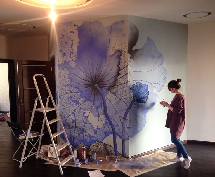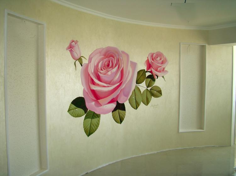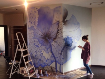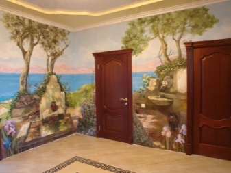 Wenn im Korridor viel Verkehr herrscht, ist die Installation von Blumenarrangements unbequem. In Familien mit Kindern ist es besser, das Interieur mit eigenen Händen zu dekorieren. Eine gute Lösung wäre, die Töpfe durch Pflanzen an der Wandmalerei mit Blumen oder anderen Plotskizzen zu ersetzen, um dem Geschmack der Besitzer zu entsprechen. Das Bild wird normalerweise aus dem Bild kopiert, das Sie mögen, auf die gewünschte Größe vergrößert und durch Pauspapier auf die Wand aufgetragen, dann wird gezeichnet.