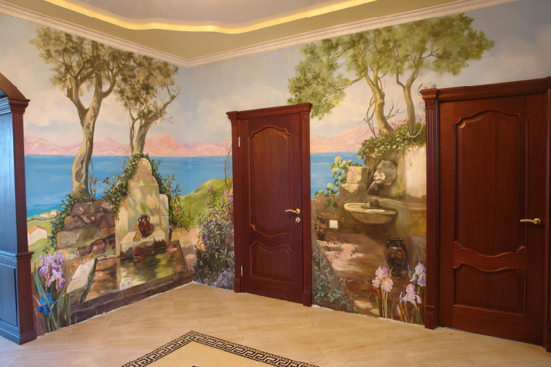 In diesem Fall ist es besser, die ferne Wand mit Wandgemälden zu dekorieren, die die Natur darstellen, ein künstlicher Wasserfall: diese Technik gibt dem Raum eine berechtigte Tiefe.