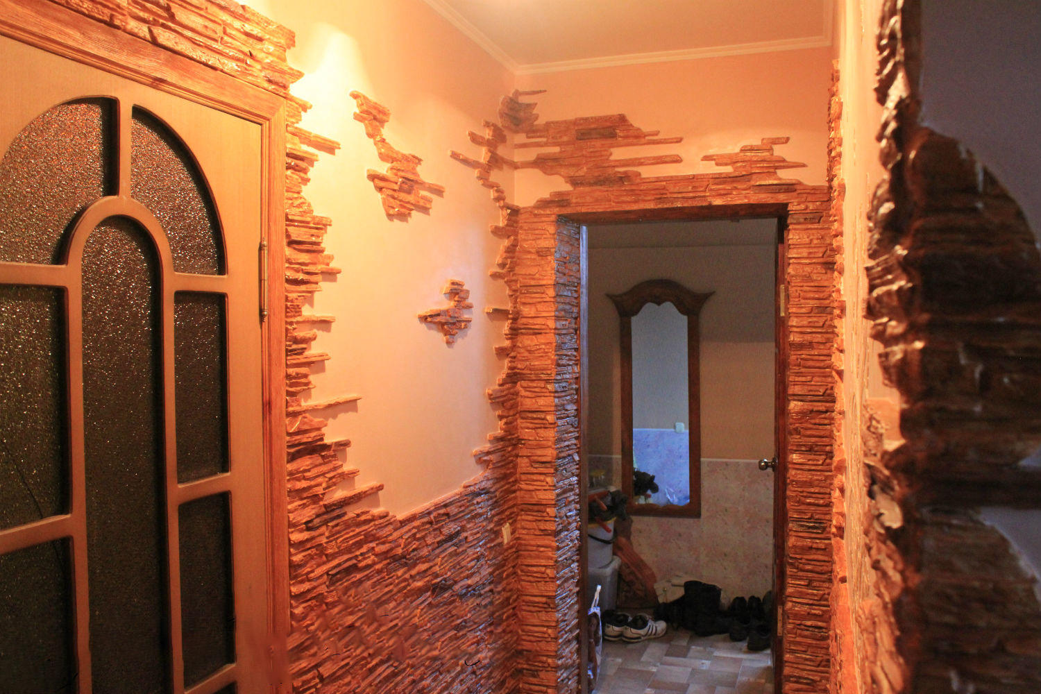 Es ist vorzuziehen, die abgeriebenen Teile der Wände mit hellen Wandpaneelen oder Kunststein zu den Wänden oder Türen zu schneiden.