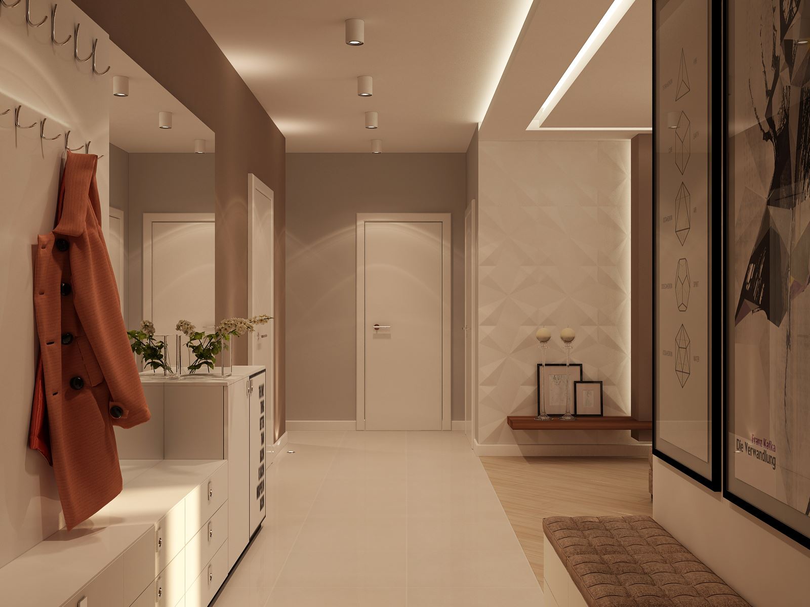 Wenn der Korridor in der Wohnung ziemlich klein ist und kein natürliches Licht hat, müssen Sie künstliches Licht und helle Farbtöne der Komposition nutzen.Die Farbe der Wände kann beige sein. Um den Abrieb von weißen Wänden zu vermeiden, ist es besser, praktische, moderne Materialien zu verwenden, die leicht zu pflegen sind und im Falle einer Verunreinigung gewaschen werden können. Von den Möbeln lohnt es sich, auf das Wesentliche zu achten, um nicht einen so kleinen Raum zu überladen.