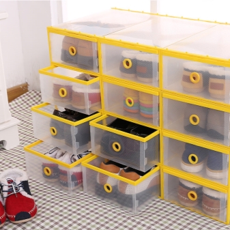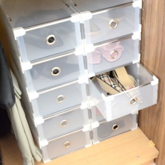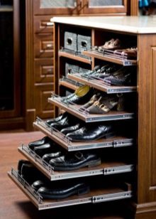Diese Regale ähneln einem gewöhnlichen Schrank, der aus vielen niedrigen Regalen besteht. Wenn Sie keine Schuhe vorführen möchten, dann ist diese Lösung perfekt für Sie. Meistens sind solche Designs aus Holz, die Farbe der Oberfläche kann beliebig sein.Wählen Sie ein Box-Design, basierend auf dem gesamten Stil des Interieurs.