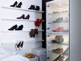 Auch in den Geschäften finden Sie Modelle von Regalen, die einen ganzen Komplex von Elementen darstellen. Es kann mehrere Regale, Gitter oder Schubladen sein. Gleichzeitig werden zum Beispiel Spiegel oder Ottomane im gleichen Stil dekoriert. Sie finden auch moderne und sehr bequeme Optionen für Strukturen, die nicht nur Regale für Schuhe sind. Dies sind Regale, in denen Aufhänger für Schuhlöffel und Staufächer für Schuhpflegezubehör vorgesehen sind.