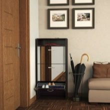 Für einen kleinen Flur können Sie den Schrank oder das Regal auf Rädern verwenden, der durch Mobilität gekennzeichnet ist. Das Produkt bewegt sich leicht an den richtigen Ort. Der Eckschuh ist auch in kleinen Räumen schön, weil es nur eine freie Ecke braucht.