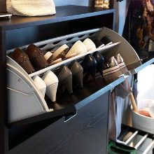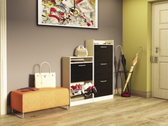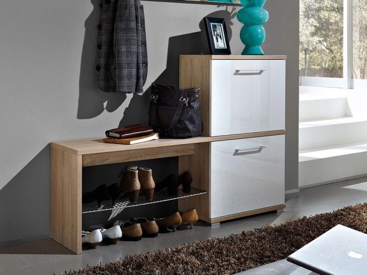 - Eine der beliebtesten Arten von Schuhen steht stehen Früher waren sie hässlich und umständlich, moderne Modelle sind elegant und stilvoll. Sie sind bereits klein, aber die Kompaktheit beeinträchtigt die Funktionalität des Produkts. Diese Option ist eine gute Wahl für eine Person. Für einen geräumigen Flur können Sie einen großen Schrank mit einem Sitzplatz abholen.