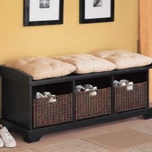 - Stilvolle Bank Ausgestattet mit einem weichen und bequemen Sitz, damit Sie sich hinsetzen und Ihre Schuhe anziehen oder ausziehen können. Es ist nicht für die Aufbewahrung von Schuhen gedacht, sondern nimmt nur zusätzlichen Platz in Anspruch, daher ist es nicht empfehlenswert, es für die Einrichtung von Fluren zu verwenden.Ein Modell mit Regalen ist praktischer, aber es kann eine kleine Menge Schuhe passen.