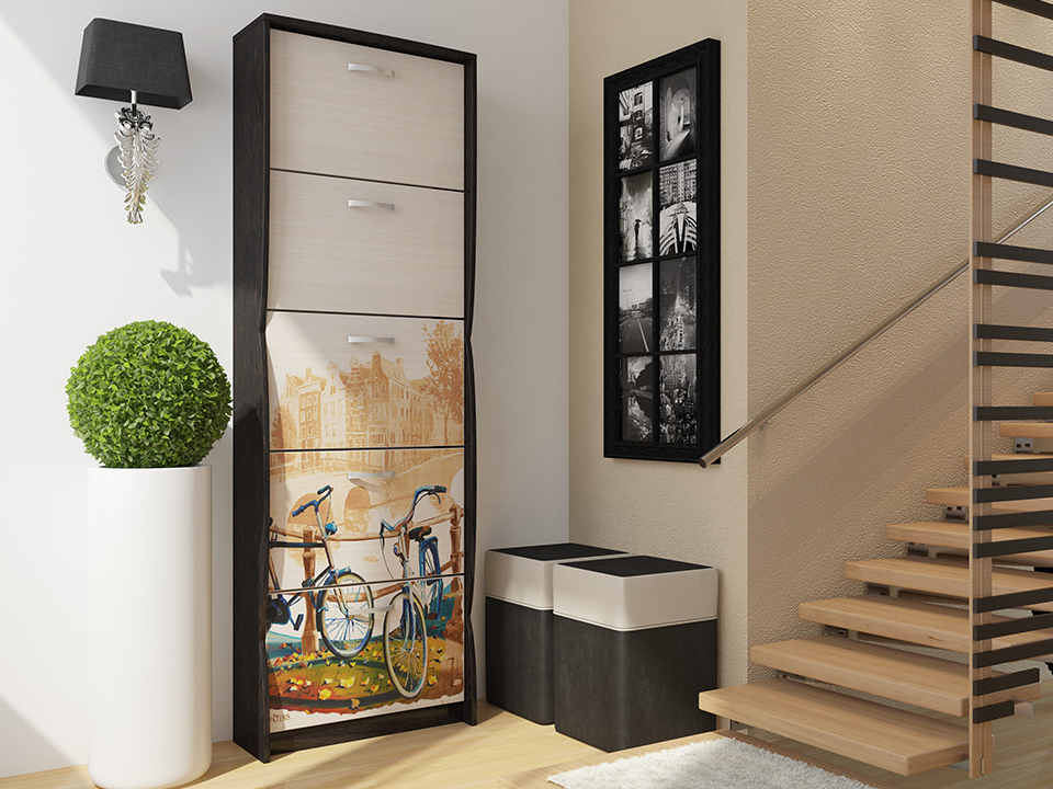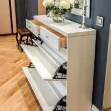 Der schmale Schuhkarton ist ideal für die Einrichtung eines langen und schmalen Ganges. Die Produkthöhe kann unterschiedlich sein. Hohe Modelle haben maximale Kapazität. Hohe Produkte müssen zusätzlich an der Wand befestigt werden, um eine zuverlässige Fixierung zu gewährleisten. Niedrige Modelle sind stabil und benötigen daher keine zusätzlichen Maßnahmen zur Fixierung.