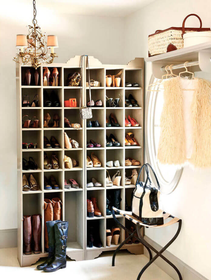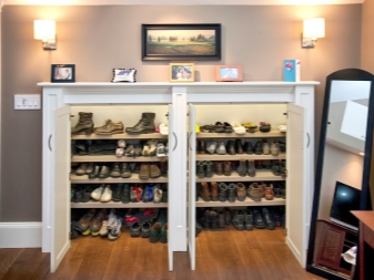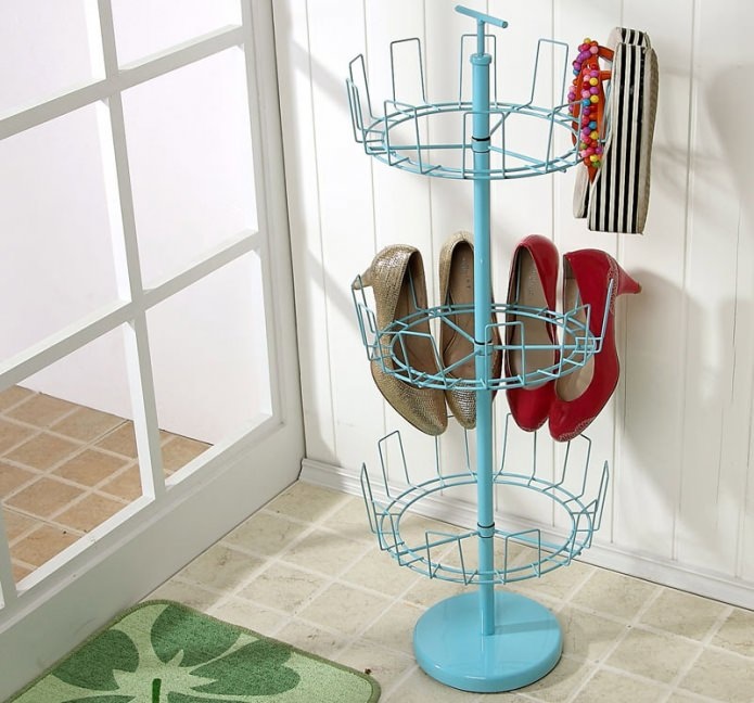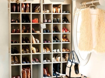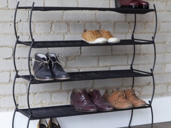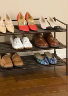 - Regale mit Regalen sieht aus wie ein Schuhgeschäft. Es eignet sich für eine große Anzahl von Paaren, daher wird es oft von Frauen aus der Mode- oder Großfamilie gewählt.