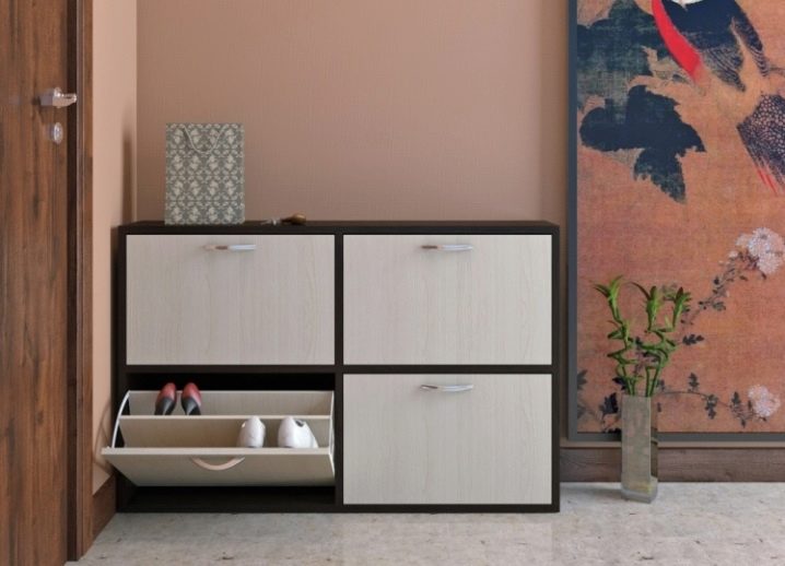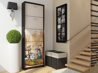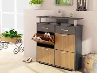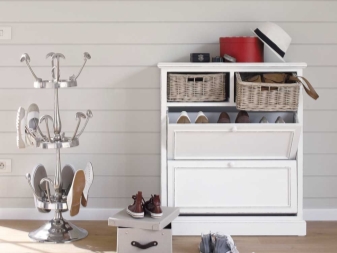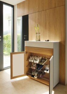- Manchmal, wenn der Flur geschmückt wird, werden Schuhe aufbewahrt stehen, dank einer Vielzahl von Designlösungen und Funktionalität. Es ist aus natürlichem Holz oder Metall hergestellt. Einige Optionen sind auf Rädern für Mobilität und Komfort während der Reinigung dargestellt. Offenes Design sorgt für schnelles Trocknen der Schuhe.