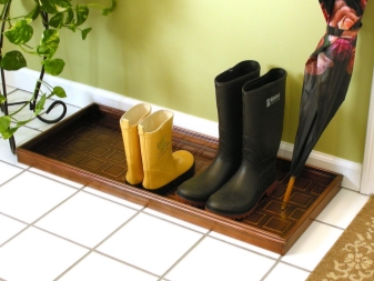- Eine gute Wahl für schmutzige Schuhe ist Fach. Das Design des Produkts lässt Wasser aus dem Schuh fließen und trägt zu seiner schnellen Trocknung bei. Dieses Produkt ist perfekt für einen verschneiten Winter. Modelle haben eine spezielle gerippte Oberfläche. Sie werden normalerweise aus Kunststoff hergestellt.