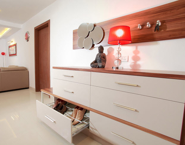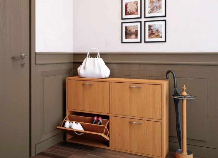 - Für geräumige Flure sind perfekte Schuhe aus Naturholz. Es zeichnet sich durch eine lange Lebensdauer aus, sieht in verschiedenen Stilrichtungen schön aus. Aber Holz hat auch Angst vor hoher Luftfeuchtigkeit.