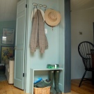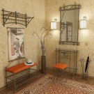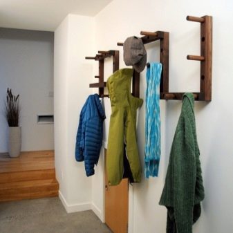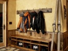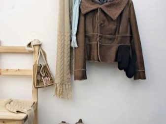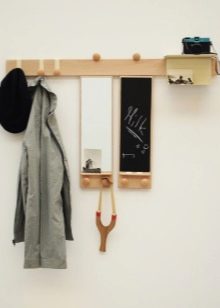 Eine andere Lösung ist Holzwand der Querstreben mit Haken und Regaleninstalliert in der Nische des Korridors oder in seinem Durchgangsteil. Es braucht ein wenig Platz und passt auf sich selbst und Schuhe und Kleidung und ein Paar Hüte. Für ein romantisches Interieur wählen Sie einen Metall-Kleiderbügel in Form eines großen Stuhls mit einem weichen Sitz und durchbrochenen Haken.