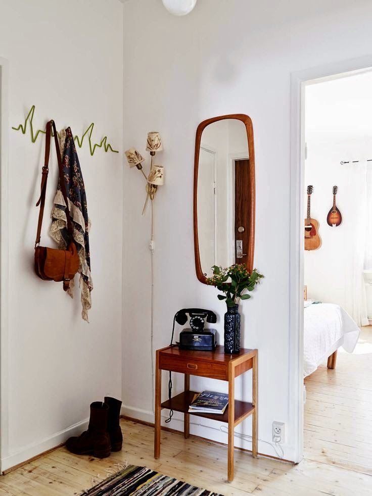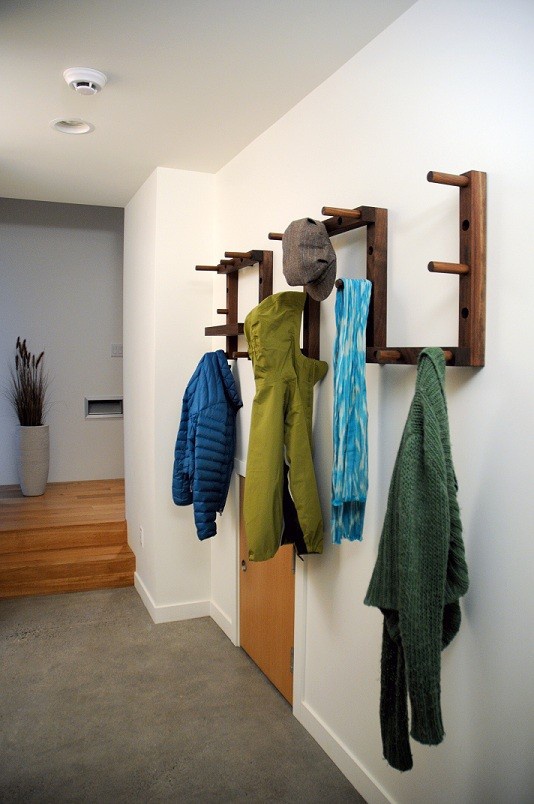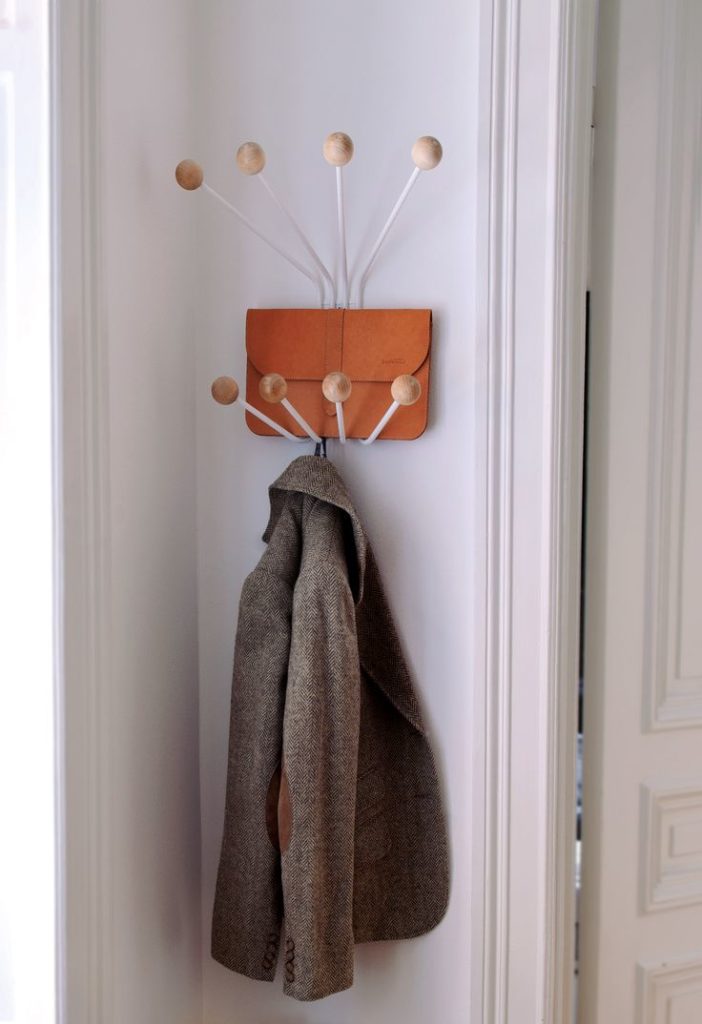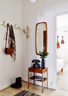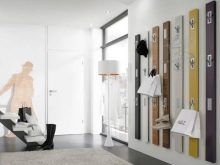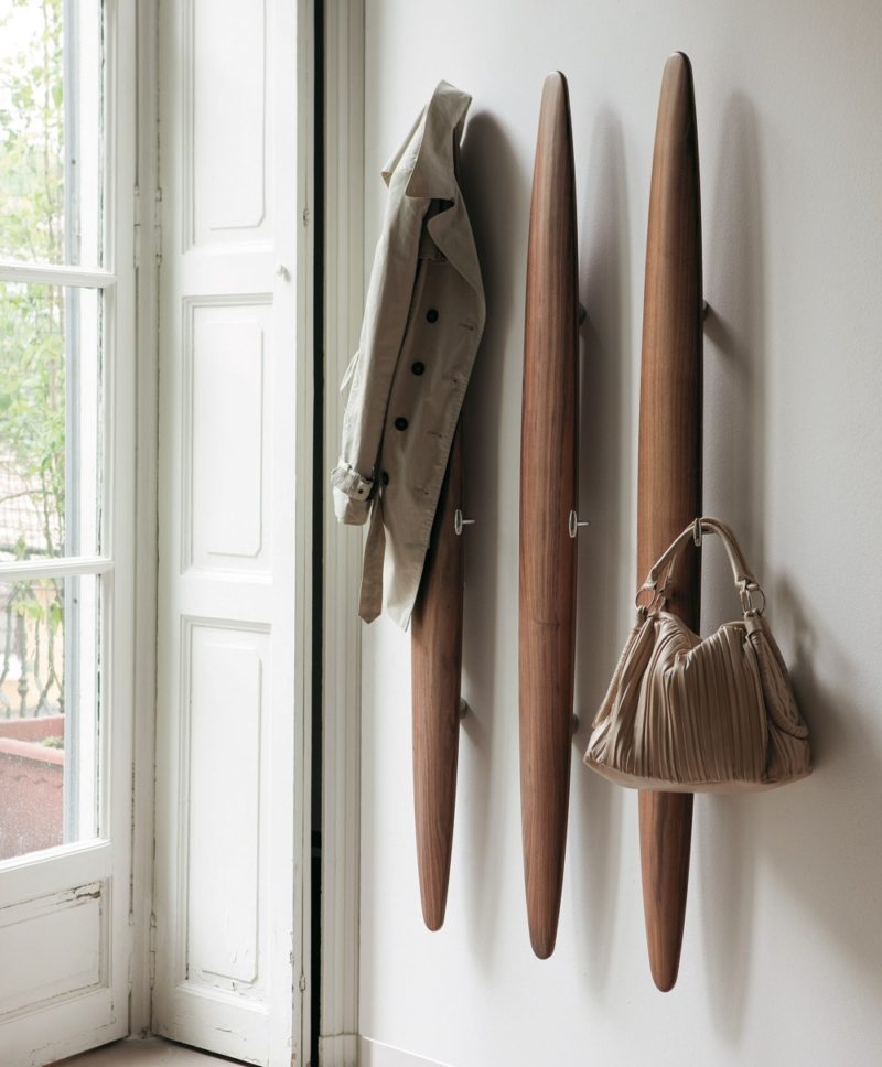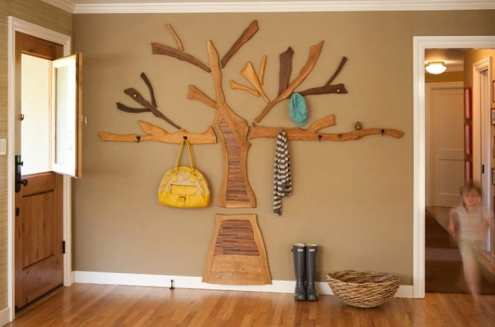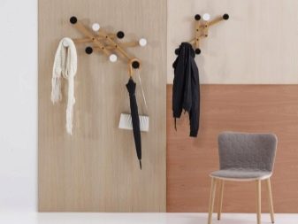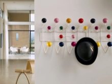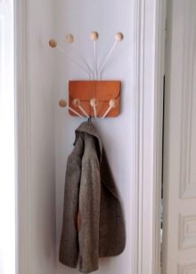 Akzent im minimalistischen Korridor wird ein Kleiderbügel mit Drop-Down-Haken, die im normalen Leben keinen Hinweis auf Funktionalität haben. Skandinavischer Stil Das Interieur ist berühmt für seine Natürlichkeit. Wählen Sie daher Holzstrukturen mit einem Minimum an Dekor. Für die Provence oder das Land ist es auch angemessen, einen Baum in einem hellen Pastellton zu malen oder im Allgemeinen mit einer Reihe von Metallhaken im Rohzustand zu bearbeiten.