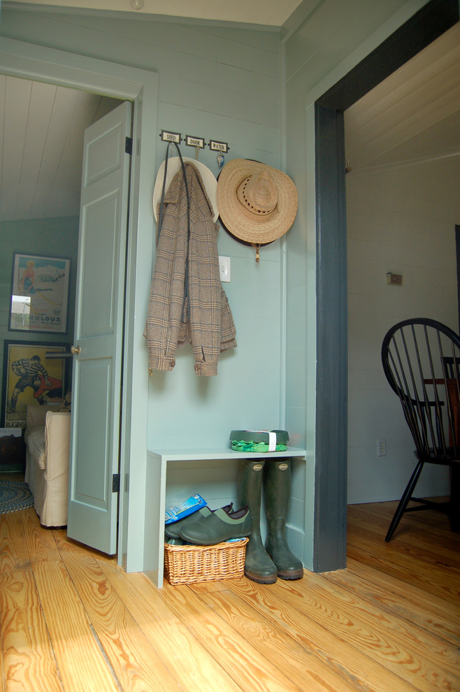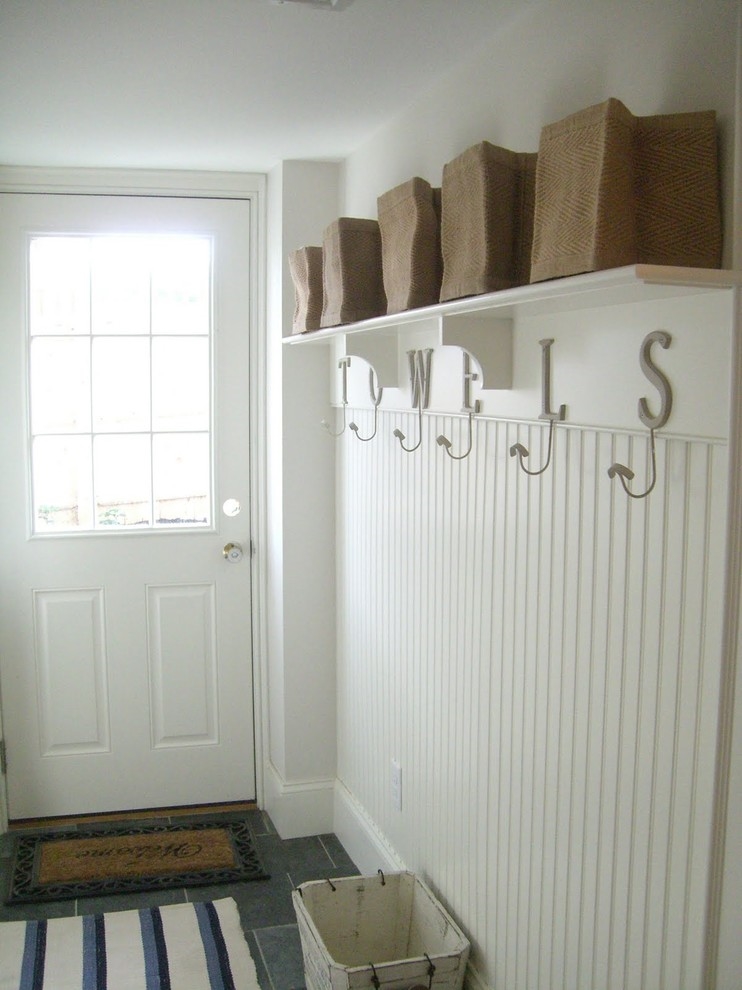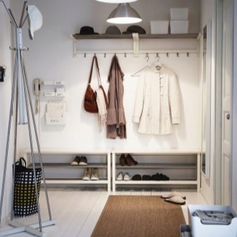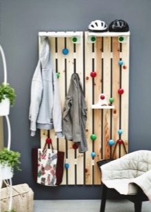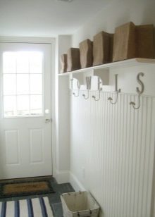 Haken ermöglichen es Ihnen, Kleidung frei zu hängen, und das Paneel selbst dient als ein ausgezeichnetes Element des Dekors und trägt eine gewisse Funktionalität - es hält Haken und verbindet die Sitze mit einer Nische für die Lagerung von Schuhen.