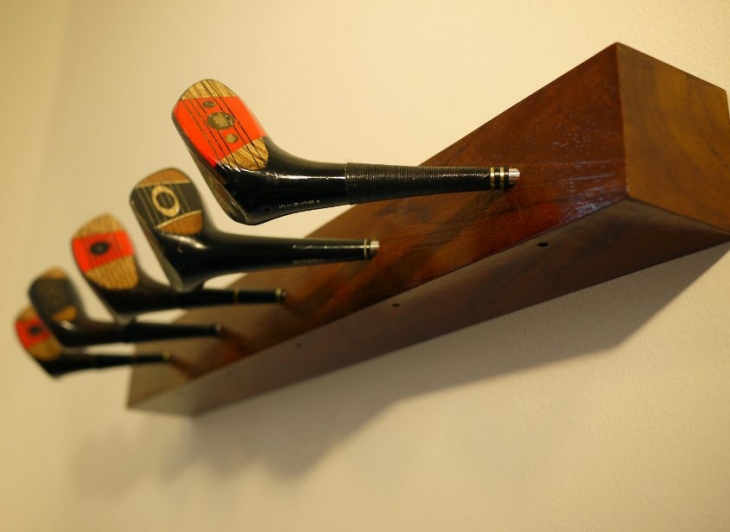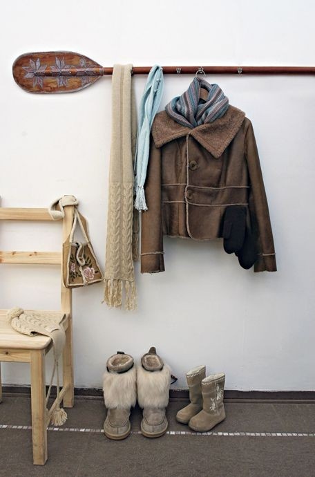 Eine gute Idee wäre es, ein normales Paddel zu verwenden: Es wird die Haken halten und das Innere des skandinavischen Gangs merklich verändern. Anstelle eines Paddels können Sie einen Hockeyschläger oder einen Golfschläger, ein anderes Sportgerät verwenden, um es sicher an der Wand zu befestigen und Nagelhaken daran zu befestigen.