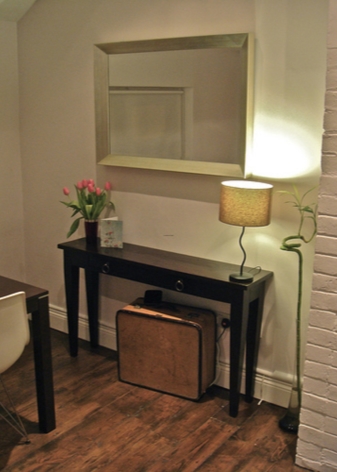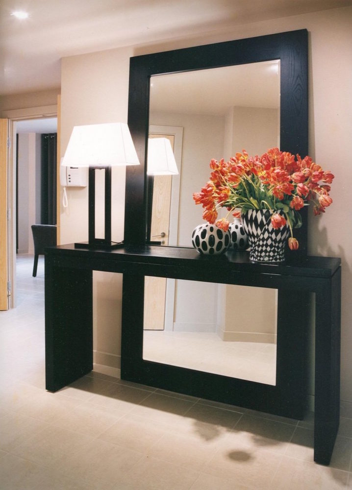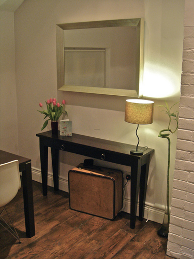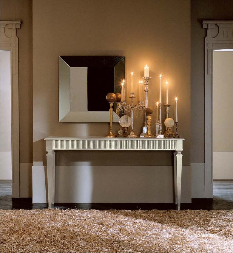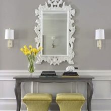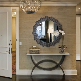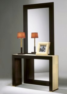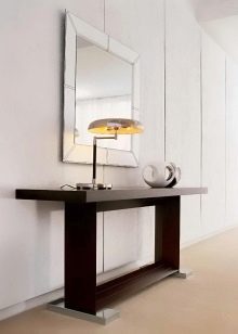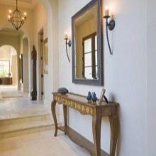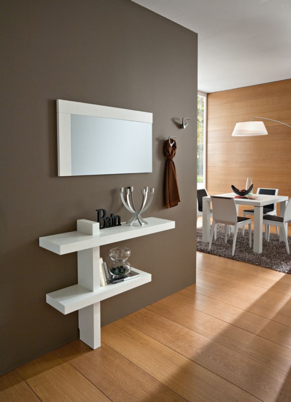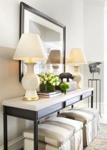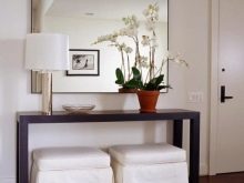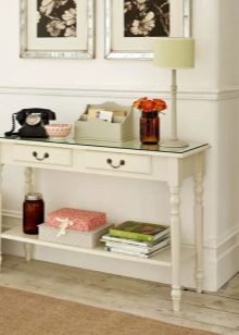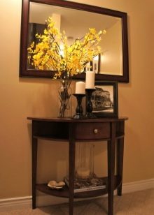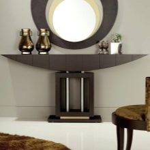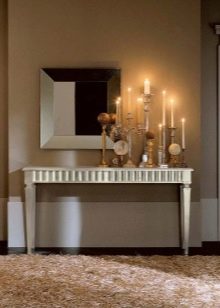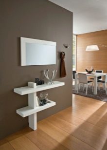 - Miniatur-Tischgröße Damit können Sie den Flurbereich optimal nutzen. Darüber können Sie einen Spiegel, ein Regal für einen Kamm oder eine Kopfbedeckung, einen Schlüsselhalter oder etwas anderes platzieren. Unter dem Tisch kann man einen kleinen Puff setzen.Wenn die Dimensionen des Flurs es erlauben, können Sie die Konsole und als Ständer für Zeitschriften oder schöne dekorative Objekte verwenden. Es ist nicht notwendig, auf dem Tisch nur einen Tresor für alle möglichen Fremdgegenstände anzuordnen. Um die Eleganz der Situation zu unterstreichen und den Flur nicht zu verschmutzen, lassen Sie es halb leer.