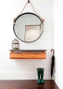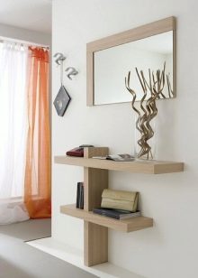 - Suspendiert. Diese Art von Konsole sieht eher wie ein normales Wandregal aus, der einzige Unterschied liegt im dekorativen Bein, das oft nicht den Boden erreicht und dem Design den Anschein eines in der Luft "festsitzenden" Tisches verleiht. Solche Modelle sind auch an der Wand befestigt. Sie werden oft mit Spiegeln ergänzt.