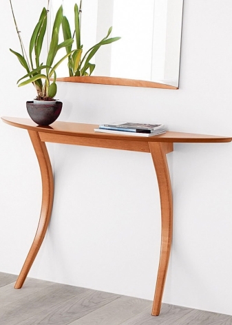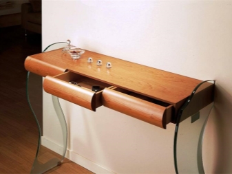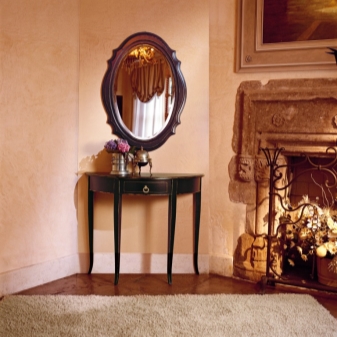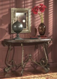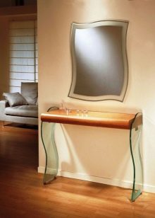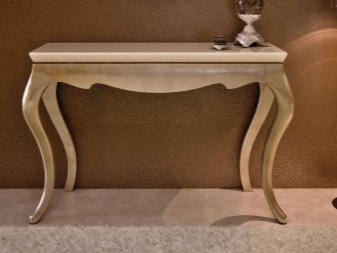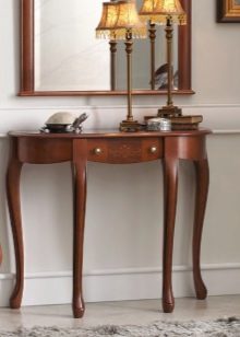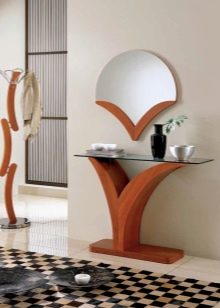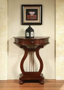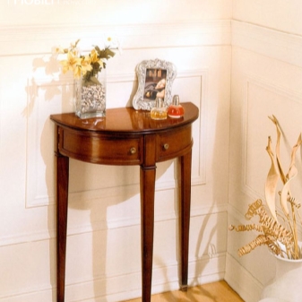 Traditionell hat die Konsole eine halbkreisförmige Form. Dies ist die Art, die das berühmte architektonische Element hatte, was zu einem neuen Trend in der Gestaltung von Räumlichkeiten führte. Moderne Tabellen können jedoch ein anderes Design haben. Nicht weniger elegante Modelle mit einer schmalen rechteckigen Tischplatte, während die Kanten scharf, abgerundet oder sogar wellig sein können.