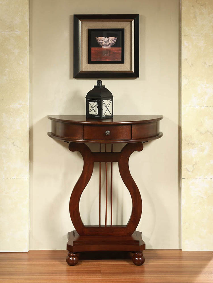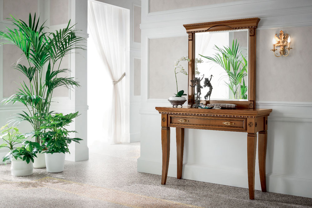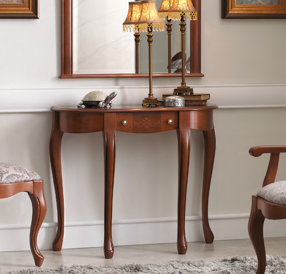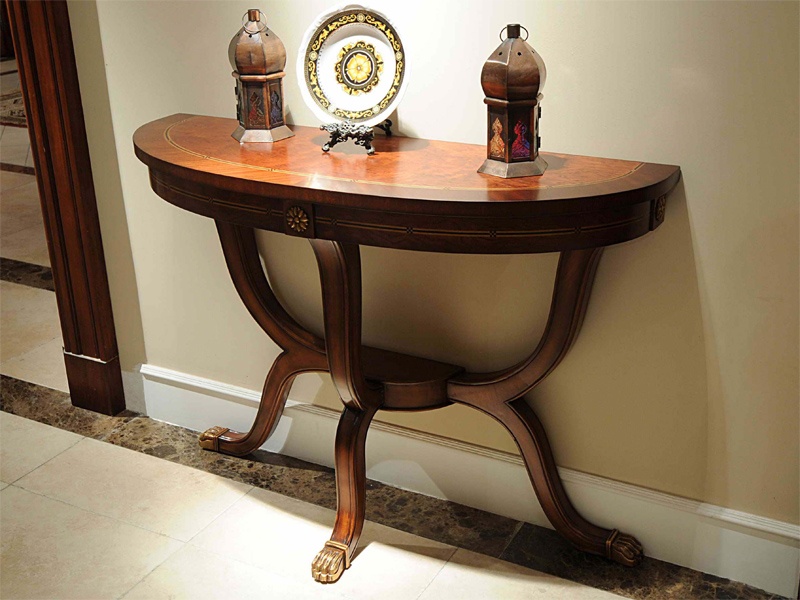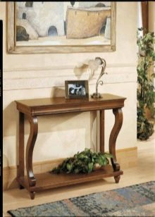 Klassische Modelle meist aus Holz ausgeführt. Da der Klassiker viele Richtungen enthält, kann das Aussehen der Produkte unterschiedlich sein: sowohl strenge lakonische Optionen, als auch luxuriöse Konsolen im "Palast" -Stil. Gemeinsame Merkmale sind nur Eleganz und anspruchsvolle teure Art von Tabellen. Dies ist normalerweise ein Modell von Holz oder seiner Nachahmung. Die Farbpalette umfasst natürliche Beige- und Brauntöne, manchmal werden Weiß und Schwarz verwendet.