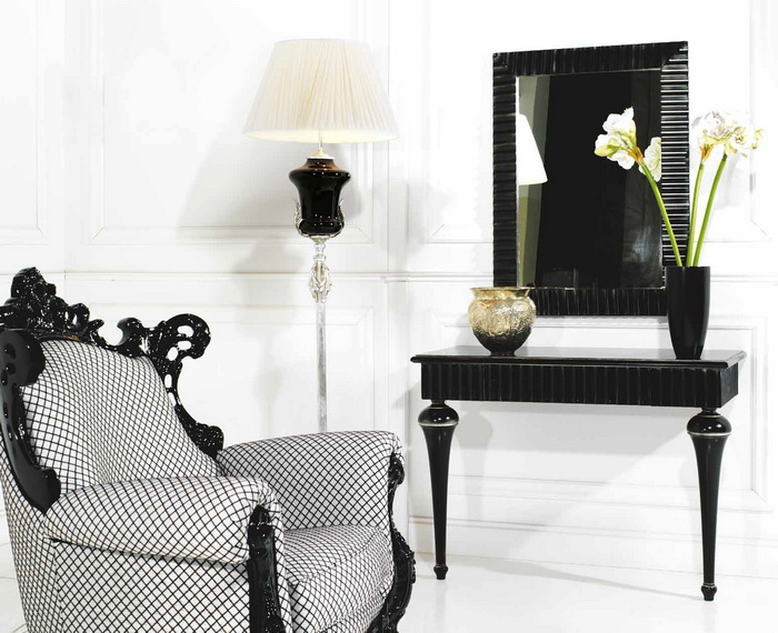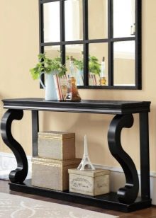 Eine weitere spektakuläre und eine weitere Kontrastoption ist die schwarze Konsole. Besonders luxuriös aussehen solche Modelle glänzend, aber es ist daran zu erinnern, dass die Farbe der Wände in diesem Fall ziemlich hell sein sollte, sonst wird der Tisch einfach vor dem Hintergrund des gesamten Innenraums verloren gehen. In der Regel erhalten schwarze Konsole für den Flur im Stil von High-Tech, Minimalismus, Art Deco.