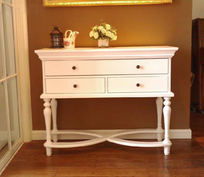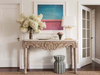 Chebbi-Chic und Provence Erinnerungen an ein romantisches französisches Dorf wecken. Natürliche Materialien, helle Farben, Raffinesse, kombiniert mit Wohnkomfort - das sind die Merkmale von Möbeln in diesem Stil. Solche Konsolentische sind aus Holz oder Materialien, die es nachahmen, und in hellen Farbtönen lackiert. Meistens ist es weiß, manchmal beige, hellgrau, hellblau und Pistazien werden verwendet. Oft werden Möbel künstlich dem Alterungsprozess unterworfen. Die Einrichtung hier ist die Figur Carving, manchmal auf den Oberflächen sind diskrete Muster.