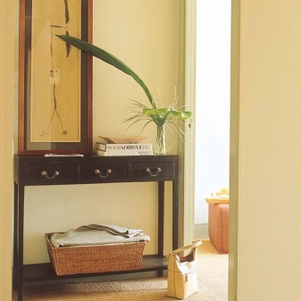 - Kompaktheit. Viele Wohnwohnungen können nicht mit geräumigen Fluren prahlen, und manchmal möchten Sie einem kleinen Korridor ein bisschen Anmut geben. Konsolen benötigen keinen großen freien Speicherplatz. Sie können einen schmalen Tisch an der Wand befestigen oder eine Ecke an der Tür platzieren, während Sie keinen einzigen kostbaren Meter verlieren und die Halle ästhetisch ansprechen.