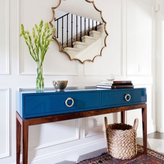 Konsolentische in hellen Farben sind nicht sehr erfolgreich.Diese Innenarchitekturoption ist nur für eine dynamische, kreative Natur geeignet. Ein roter oder blauer Tisch wird den Flur heller und unerhörter machen, aber es ist immer noch besser, solche Objekte mit neutralen Tönen zu kombinieren, um übermäßige Vielfarbigkeit zu vermeiden.