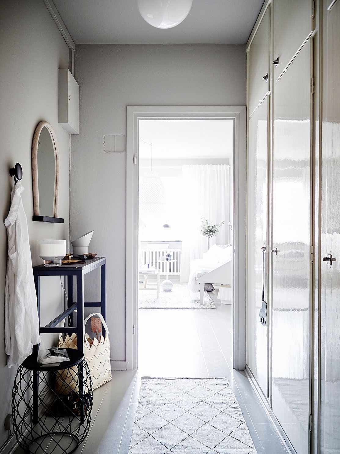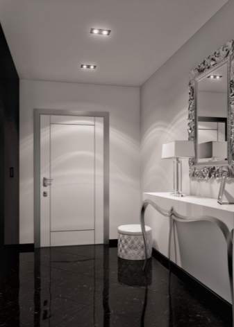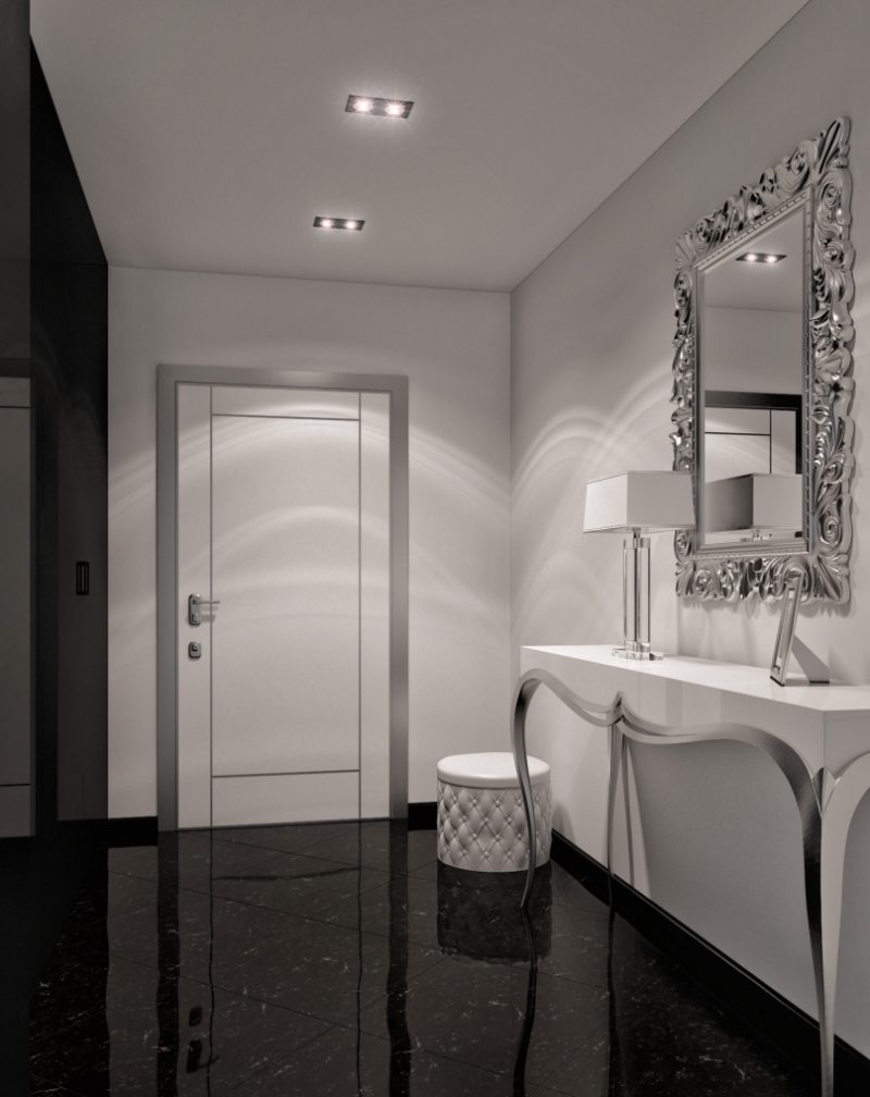 Ein weiteres Interieur in Weiß, aber in einem modernen Stil. Leichte Konsole auf Metall gebogenen Beinen perfekt mit einem Spiegel in einem schönen Rahmen aus verchromtem Metall. Das Dekor in Form einer Lampe und ein Foto in einem Rahmen bringen Individualität in den minimalistischen Rahmen. Ein schwarzer Fliesenboden schafft einen markanten Kontrast zu den neuesten Trends in der Designwelt.