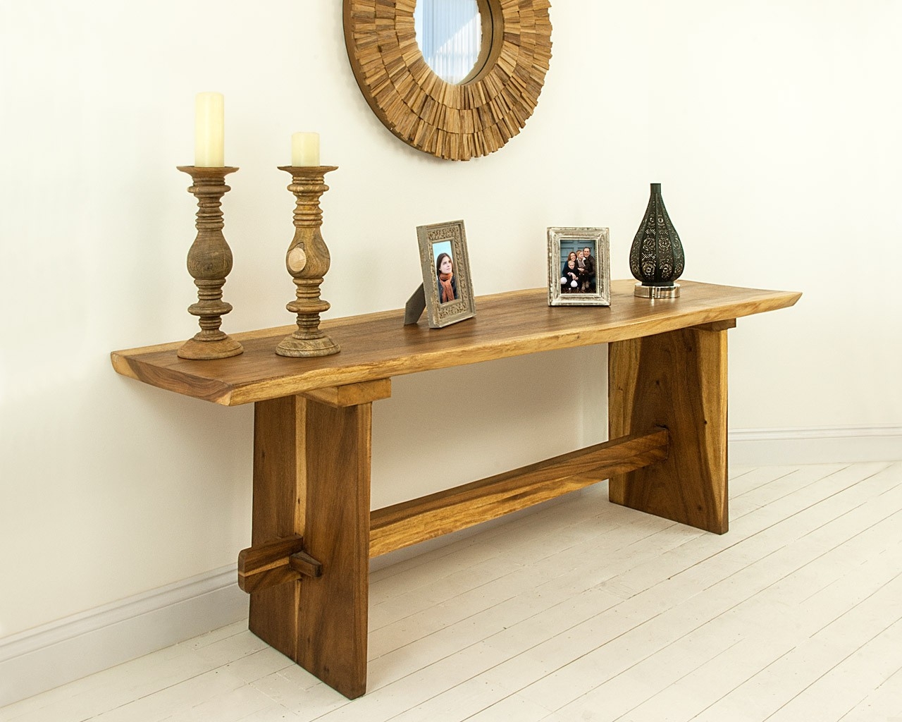 Der Charme des Chebbi Chic unterstreicht einen schmalen Holztisch mit figurierten Beinen. Raffinierte Lampen und ein Spiegel mit geschnitzten Rahmen vervollständigen harmonisch die Komposition.