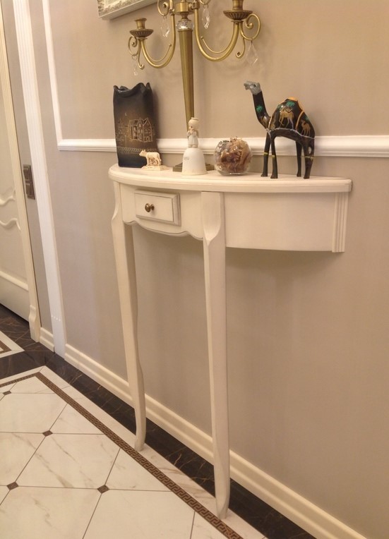 Wenn Sie möchten, können Sie die Originalkonsole selbst herstellen.Dafür brauchst du nur den üblichen kleinen Tisch. Schneiden Sie das Produkt einfach in zwei Teile und geben Sie ihm die gewünschte Farbe und Struktur. Es kommt auf Ihre Vorstellungskraft an: Sie können das Produkt streichen, lackieren, mit Patina überziehen, mit Aufklebern dekorieren.