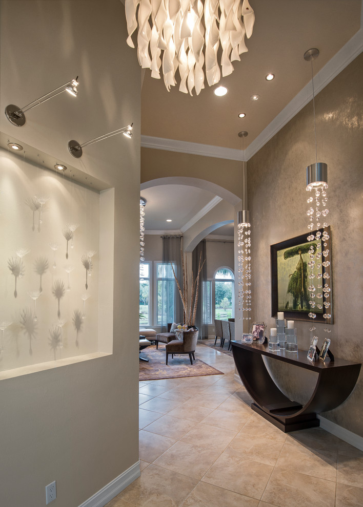 Eine weitere Variante des beigefarbenen Flurs im modernen Stil. Es gibt hier auch eine edle dunkelbraune Konsole, deren Form aber besonders originell ist. Ein Bild in dunklem Rahmen und Lampen mit Kristallperlen machen den Konsolentisch nicht nur zu einem Möbelstück, sondern zu einem besonderen Bereich voller Ästhetik und absolutem Stil.