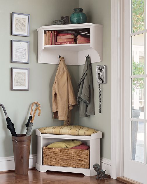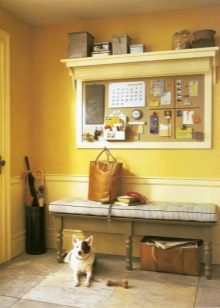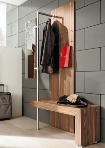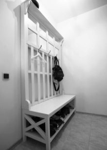 Wenn Sie ein kleiner Flur sind, kombinieren Sie die Bank mit dem Schuhkarton und dem Kleiderbügel. Dieses Design nimmt nicht viel Platz in Anspruch, ist aber komfortabel und funktional.Für einen Flur von komplexer Form, erhalten Sie eine eckige Bank.