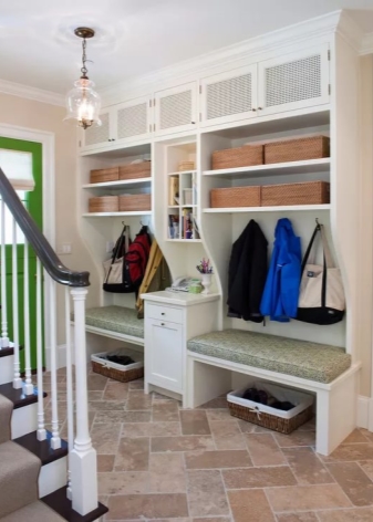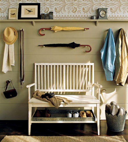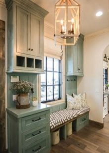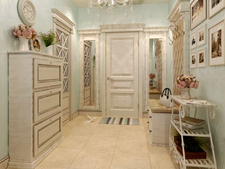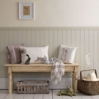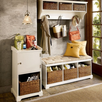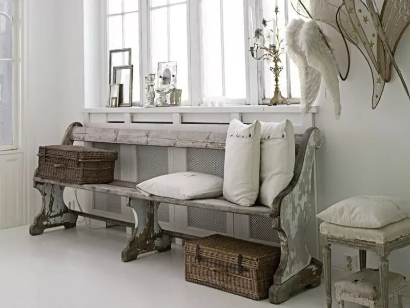 Wenn Ihre Halle im Stil der Provence eingerichtet ist, wählen Sie niedrige Bänke mit weichen Kissen oder Korbgeflecht.
