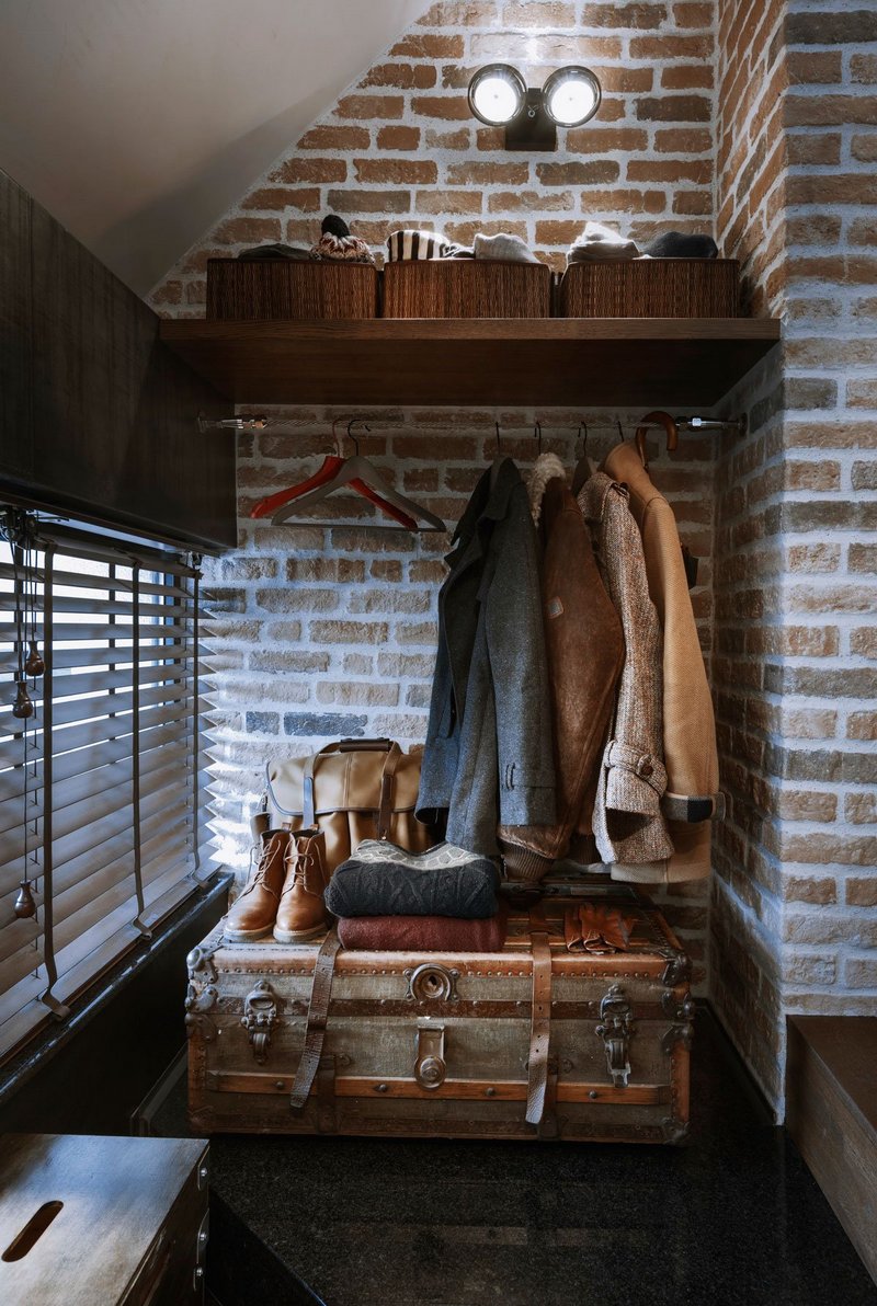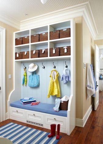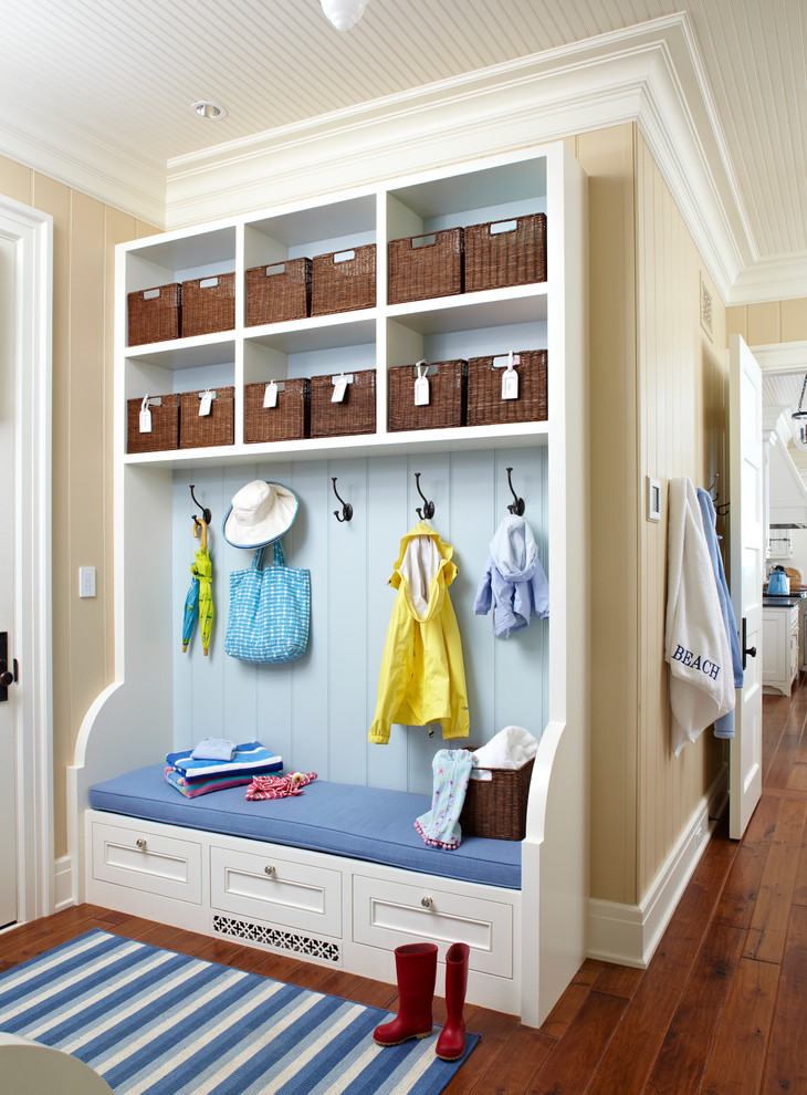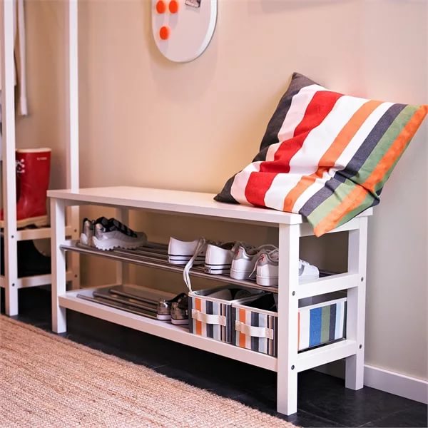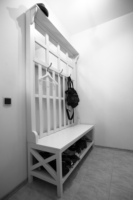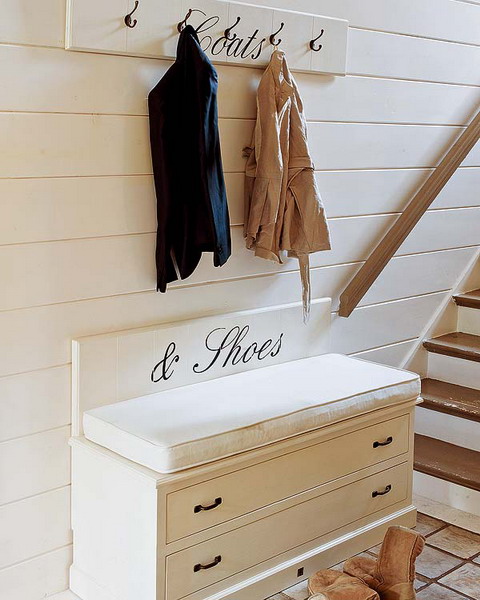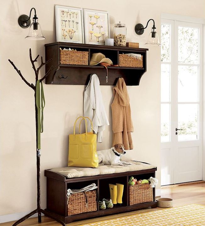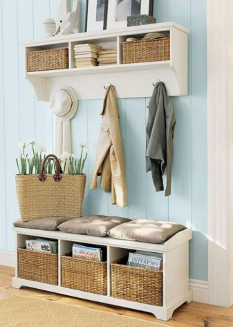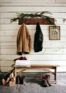 Laden im skandinavischen Stil aus grobem Holz oder Paletten. Es wird entweder weiß oder bleibt in einem natürlichen Farbton. Unter der Bank können entweder Regale für Schuhe oder Kästen angeordnet werden, die von der Stange geflochten sind.