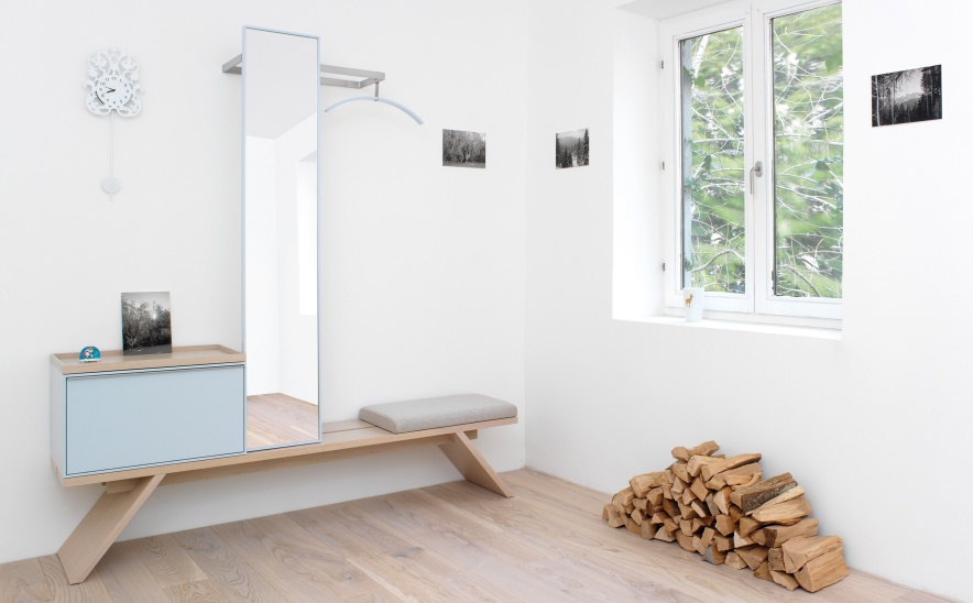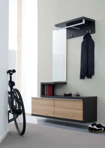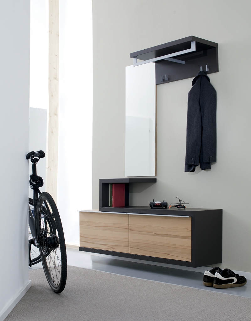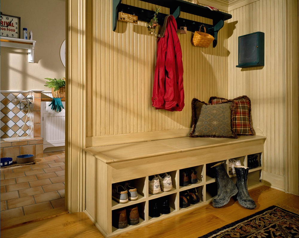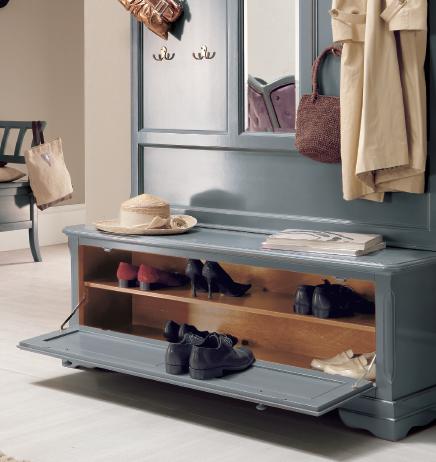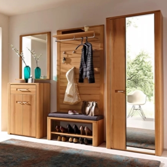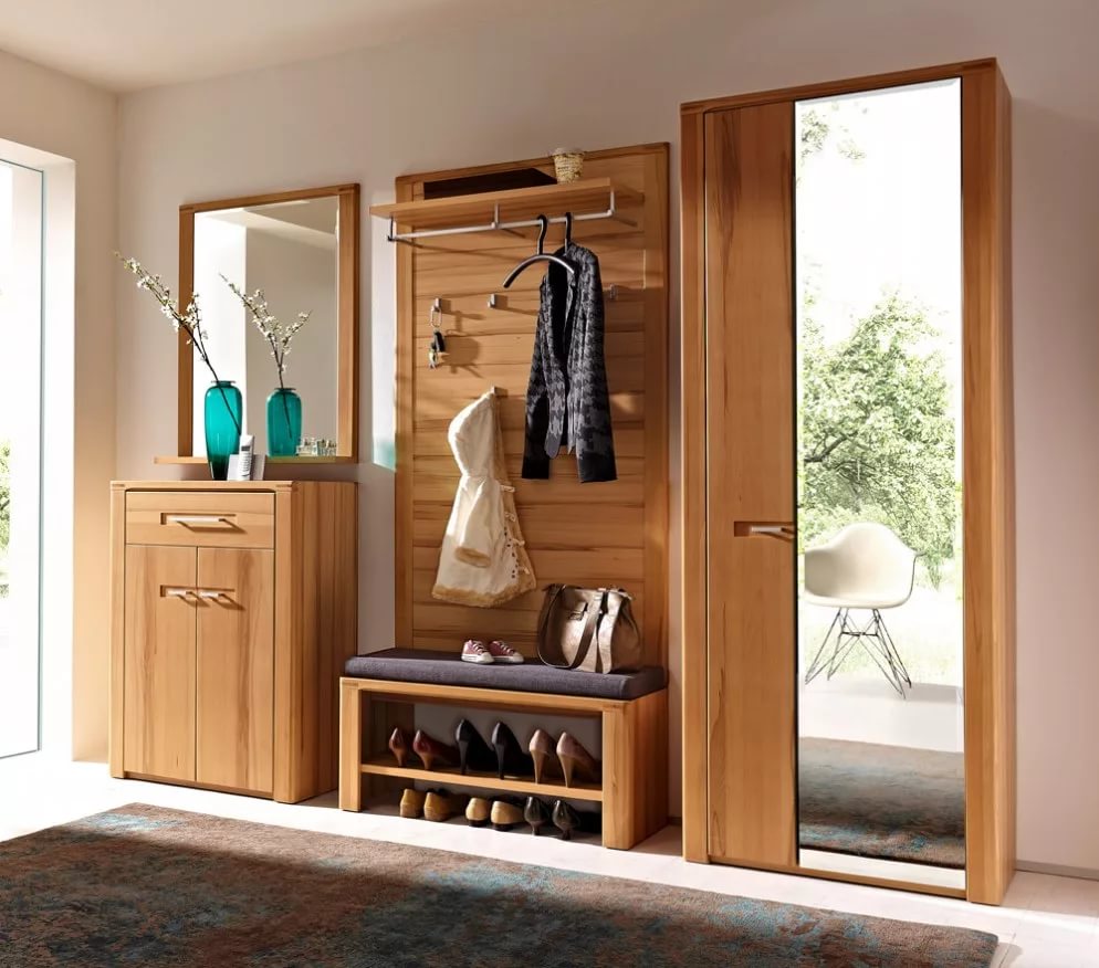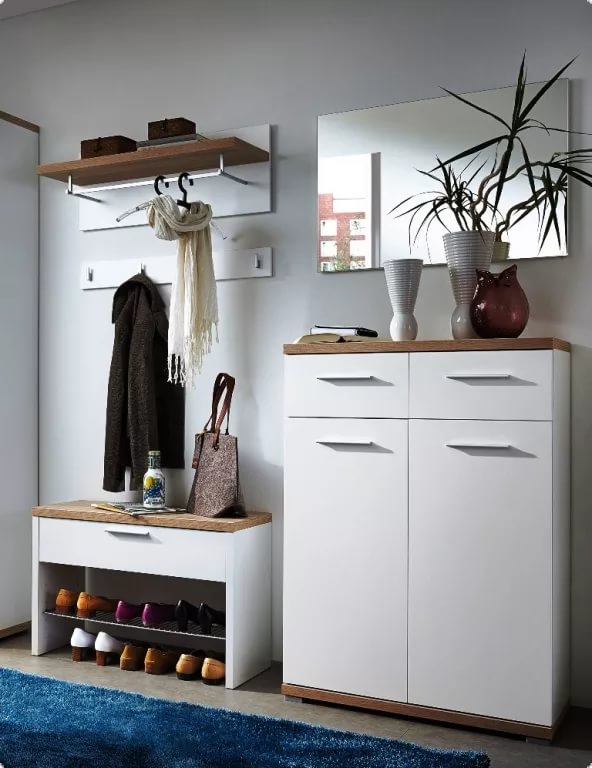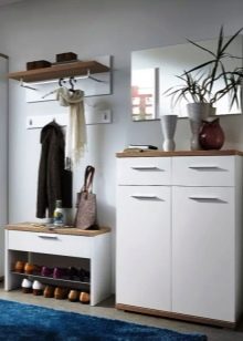 - von Möbelplatten: Spanplatte und MDF. Günstige Modelle, deren Sitz aus preiswertem Stoff besteht. Viele werden durch Klappsitze und geräumige Schubladen für die Aufbewahrung von Hausschuhen oder einige persönliche Gegenstände darunter ergänzt. Manchmal ist der Rahmen mit dickem Wildleder oder Kunstleder überzogen. Um die Tür zu sparen, sind oft aus teureren MDF und der Rahmen aus Sperrholz oder Spanplatten gefertigt.