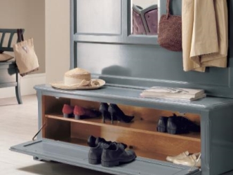 Für Liebhaber des modernen und klassischen Stils ist eine Bank mit Klappdeckel und ausziehbarem Regal eine gute Lösung. Dieses Accessoire ist praktisch und hebt sich nicht besonders von anderen Möbeln ab.