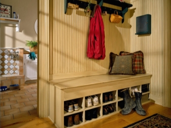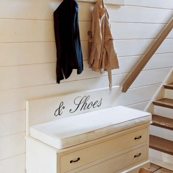Die Galoshnitsa ist ein Bordstein für Schuhe, auf denen man sitzen kann. Normalerweise sind solche Möbel aus Holz oder Holzschilden. Oben kannst du einen weichen Sitz setzen oder alles in seiner ursprünglichen Form belassen. Das Gehäuse wird auf den Boden oder die Wand gestellt, und das Design selbst kann eckig oder linear sein. Darüber hinaus ermöglichen die schmalen Schränke, die bündig mit der Wand montiert sind, die Schuhe in einer aufrechten Position zu verlassen.