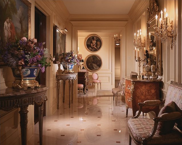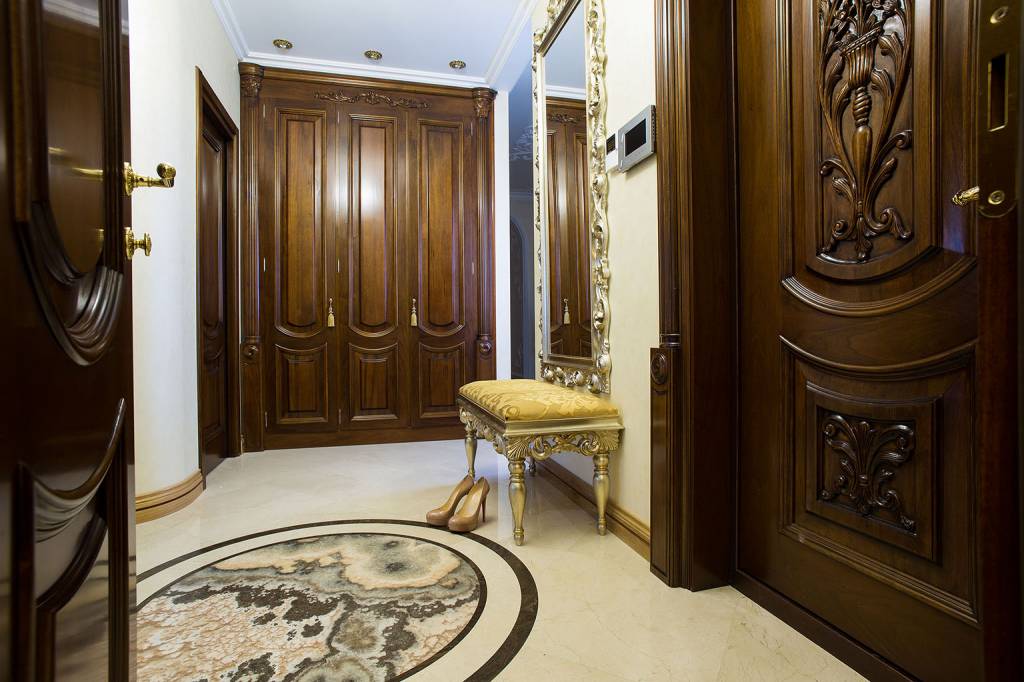 Das aristokratische Interieur beinhaltet die Verwendung von Modellen aus Leder und Holz mit eleganten Details, zum Beispiel Sofas mit weichen Sitzen. Holz muss lackiert werden, um die Lebensdauer des Produkts zu verlängern. Auch passen diese Modelle ideal in die Flure im Rokoko- und Empire-Stil.