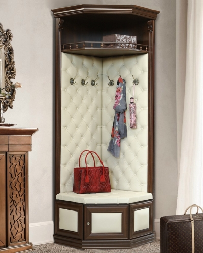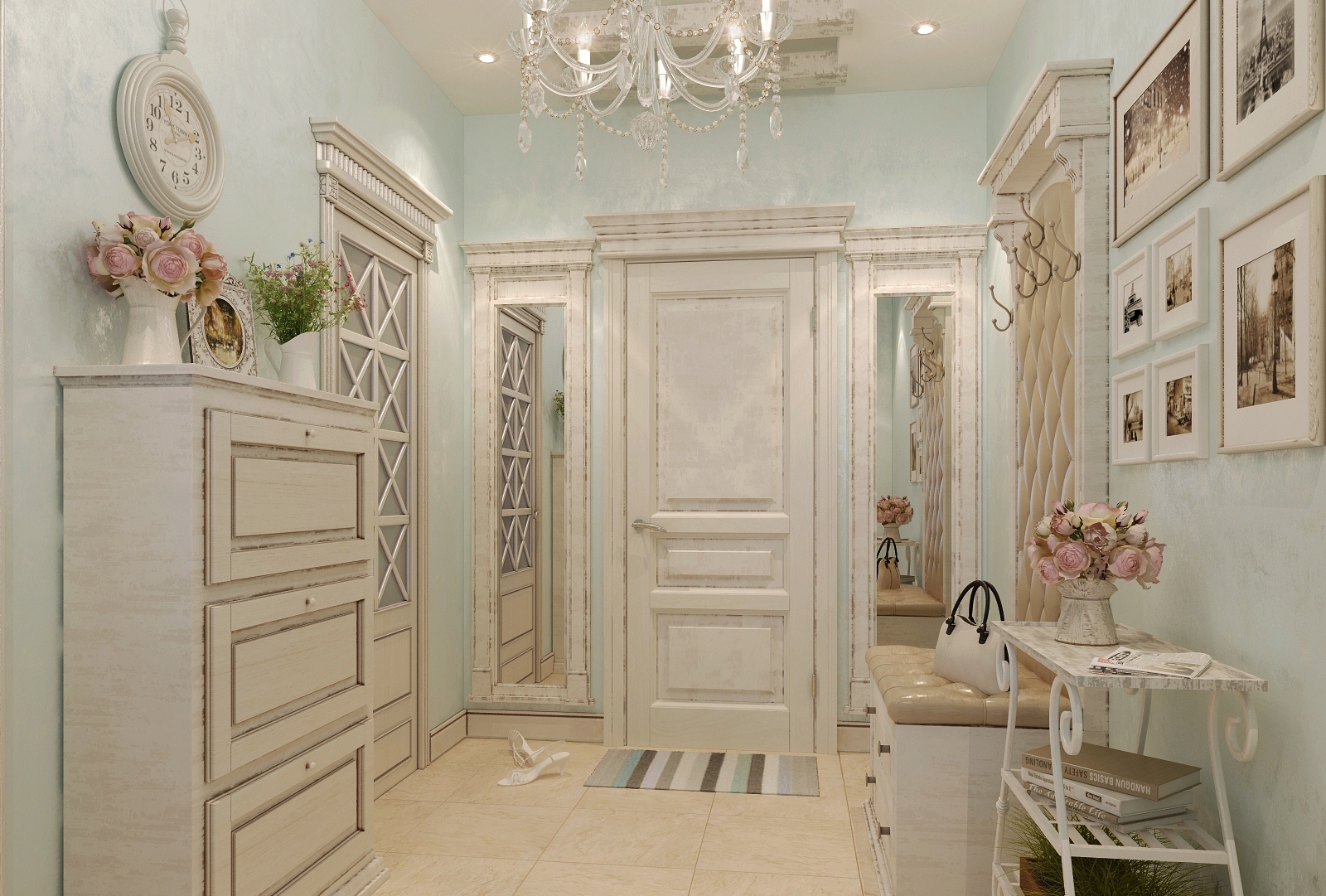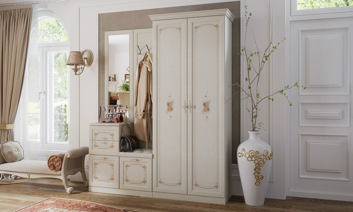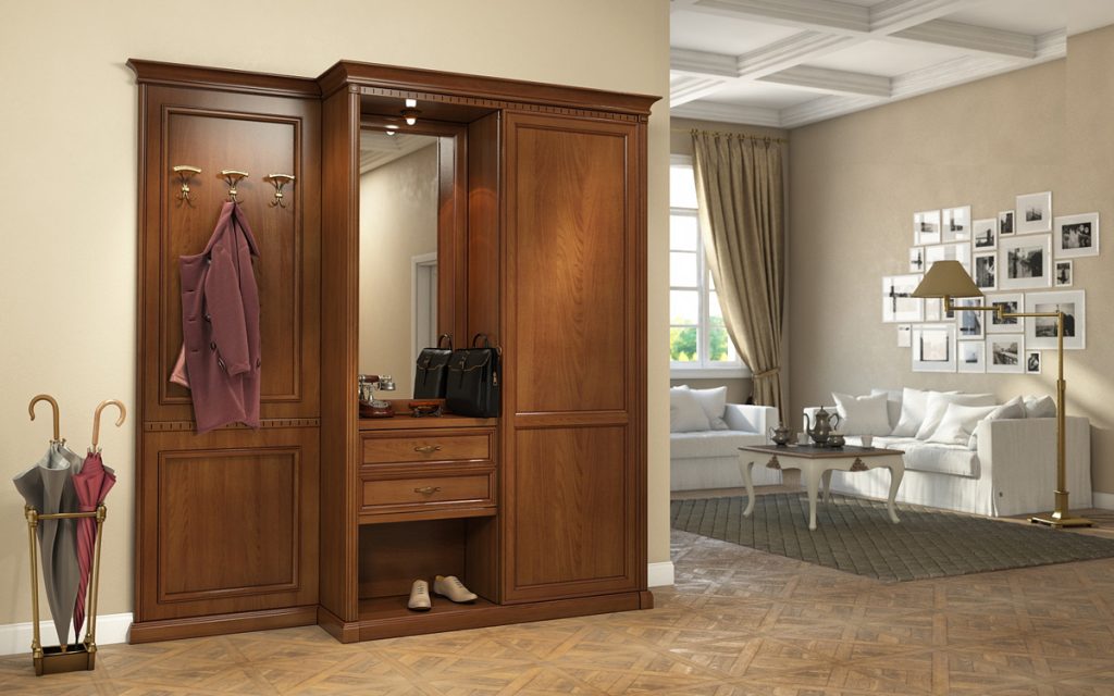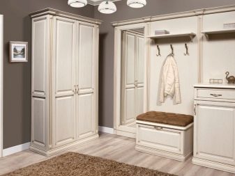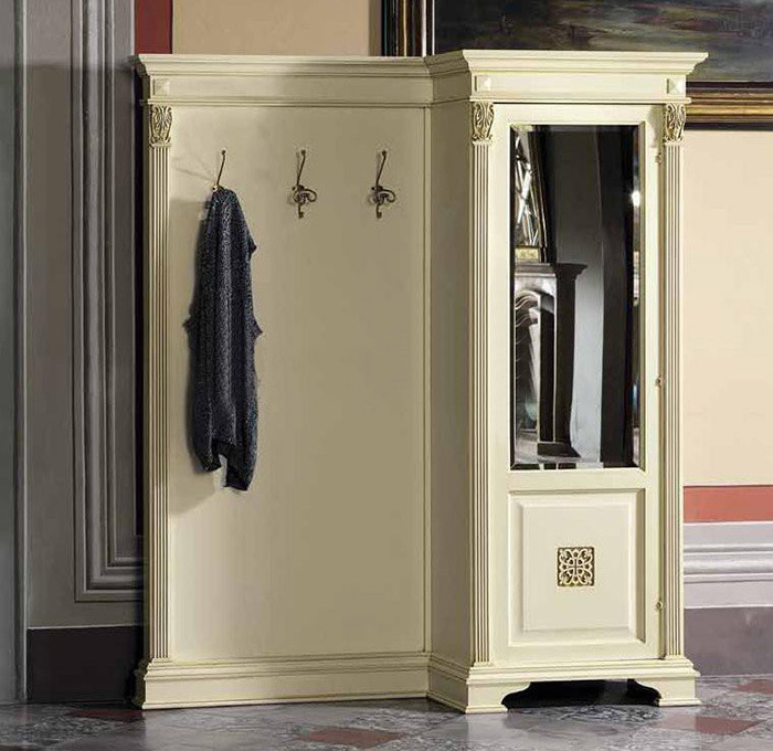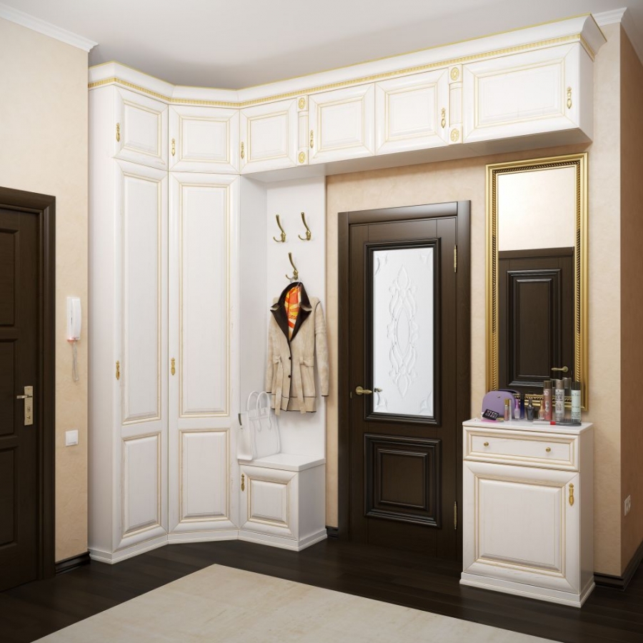 - Klassisch Klassische Schränke und Schränke ergänzen den Flur ebenfalls. Dieser Stil ist einfacher und zurückhaltender als der vorherige. Aber gleichzeitig werden dort viele luxuriöse Details verwendet. Von den Farben sind Pastell, Weiß, Gold und Dunkelgrau bevorzugt. Aus den Materialien muss man dem natürlichen Holz den Vorzug geben.