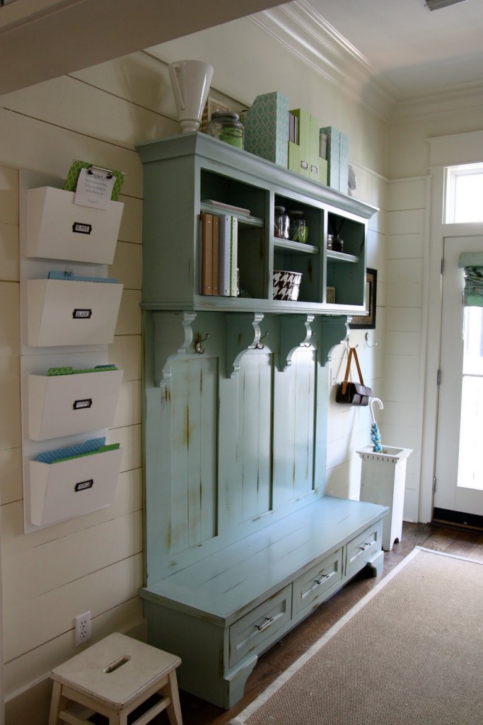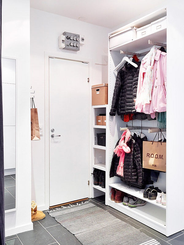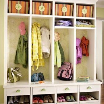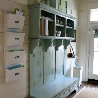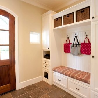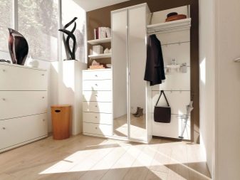 Vergessen Sie auch nicht das spezielle Fach für Schuhe. Es ist am besten, einen kleinen Nachttisch mit einer Flügeltür aufzuheben. Übrigens kann ein solcher Schrank in manchen Fällen als niedriger Ottoman verwendet werden. Nun, für kleine Dinge können Sie ein spezielles Regal aufheben.