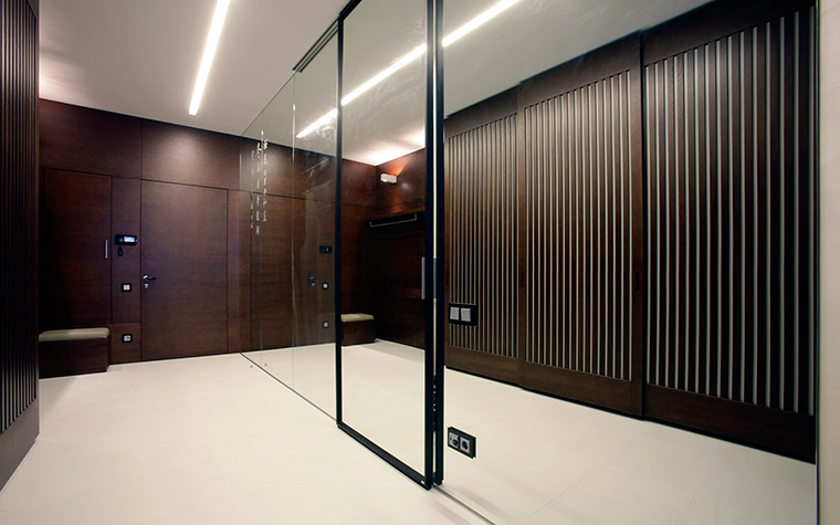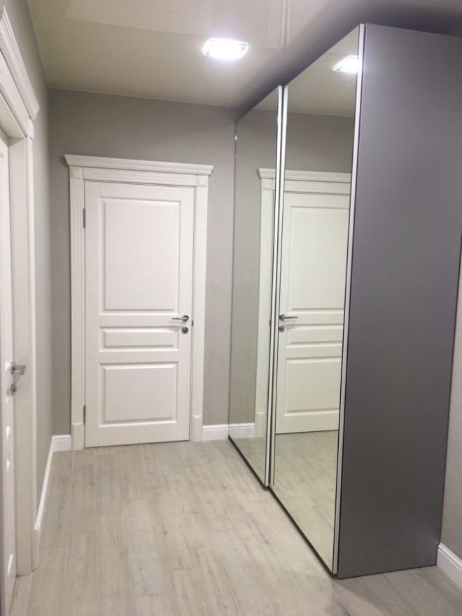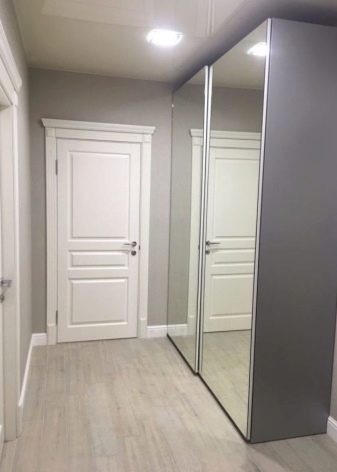 Ein zusätzlicher Bonus in diesem Fall ist eine große gespiegelte Tür an der gesamten Wand.