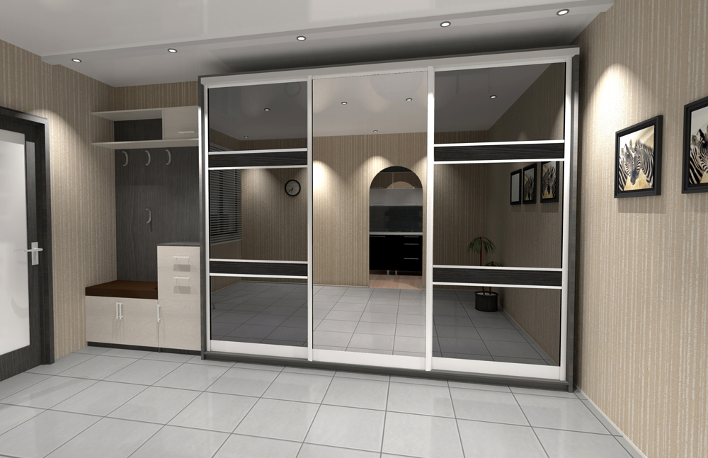 Schränke für die ganze Wand - das ist die beste und beliebteste Option für den Flur. Damit solche Möbel den Raum optisch erweitern können, sollte der untere Teil des Schrankes dunkel gewählt werden, der Sockel - Licht. Bezüglich der Farben empfehlen die Hersteller die Auswahl von horizontalen Streifen. Neben der hellen Basis können Sie den Raum optisch erweitern.