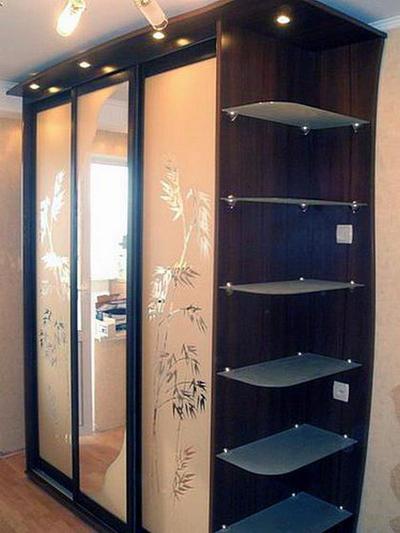 Eine der bequemsten Optionen. Der Eckschrank ist recht geräumig und nimmt nicht zu viel Platz in Anspruch. Auf den ersten Blick scheint diese Option völlig unpraktisch. Der L-förmige Schrank ist ein Modell, das schlecht genug ins Innere passt. Aber Sie können immer etwas passendes im Stil finden. Ein solches Modell kann mit einer abgeschrägten oder mit einer abgerundeten Ecke sein. Die erste Option ist für moderne Räume geeignet und die zweite sieht weicher aus.