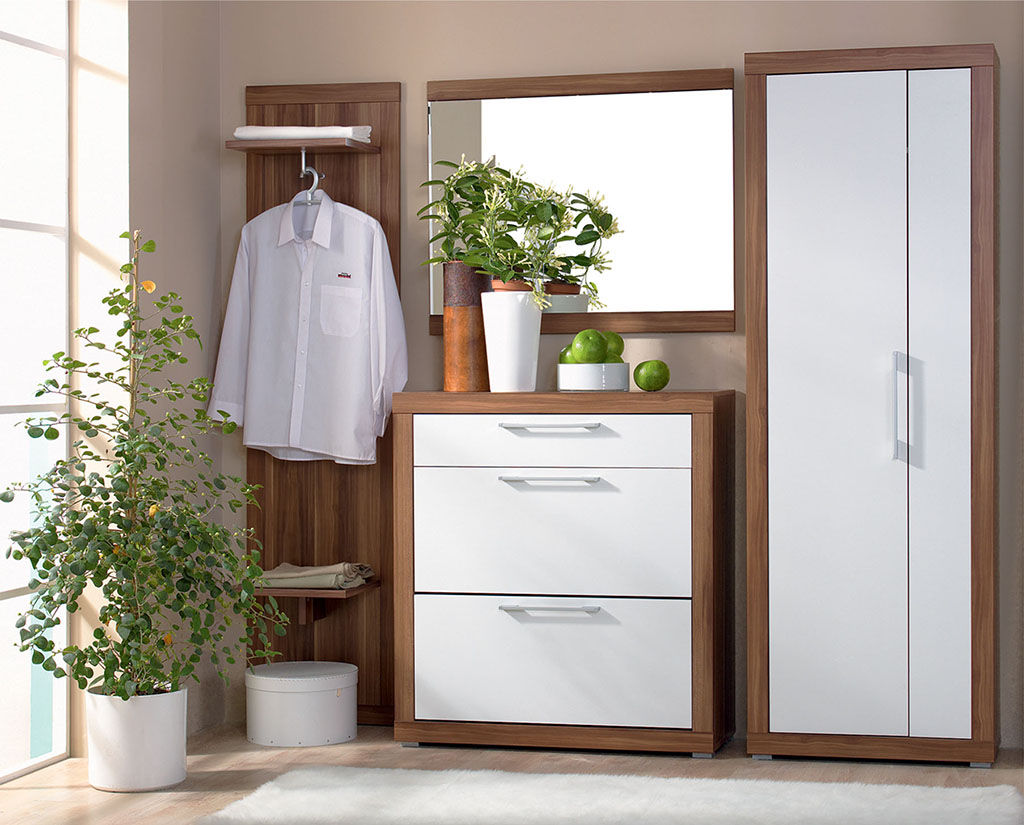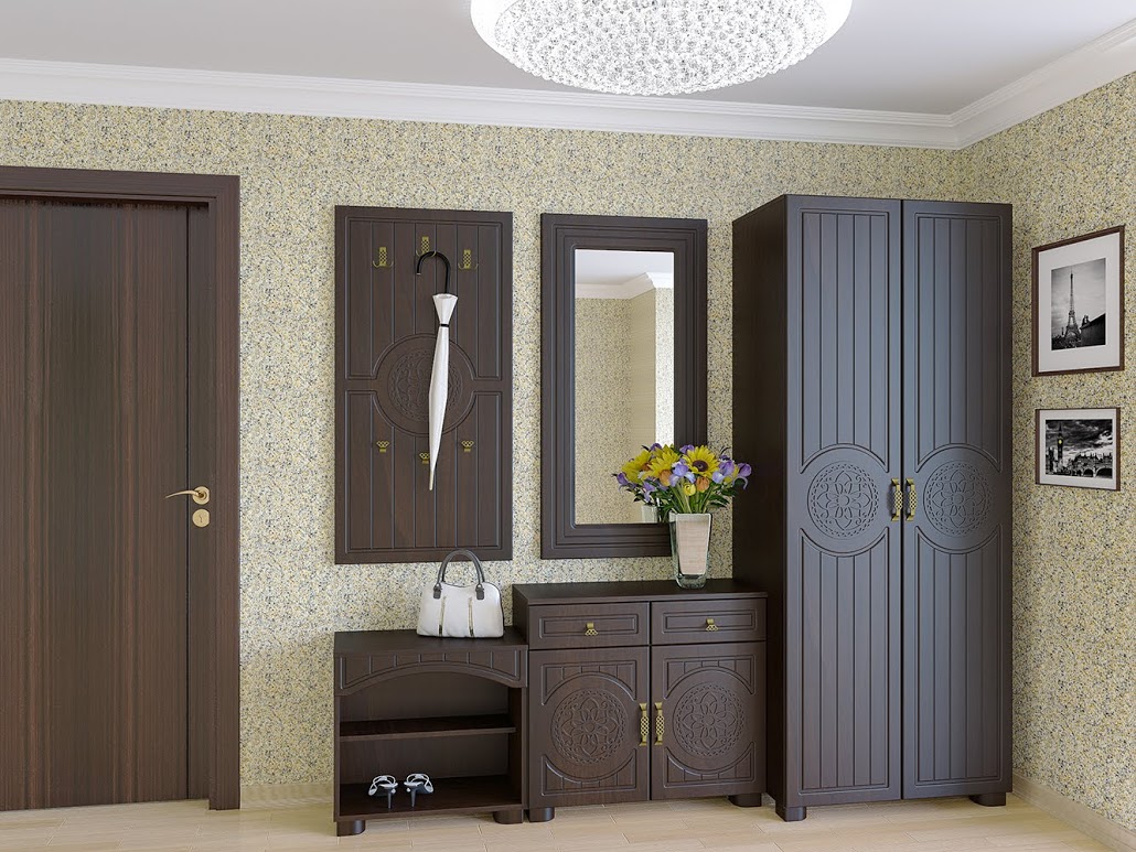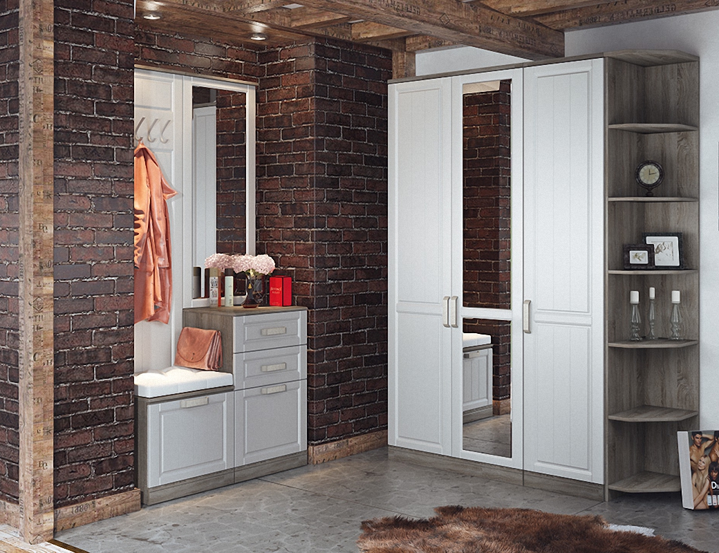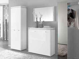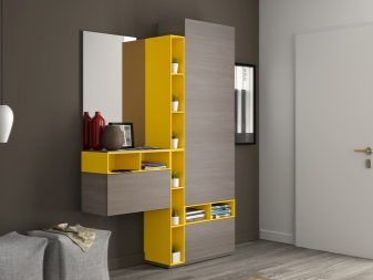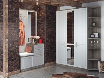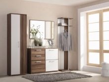 Schmale Hochsäule oder niedrige Breite - die Wahl sollte von den Parametern des Flurs und der Verfügbarkeit von freiem Raum in ihm abhängen. Wenn es zu klein ist, können Sie Optionen für kompakte eckige Daumen in Betracht ziehen. Solche Modelle werden von baltischen Möbelfirmen oder Firmen aus anderen GUS-Staaten hergestellt. Ein kleiner Poller wird leicht eine Ecke nehmen und den Raum des Flures frei machen.