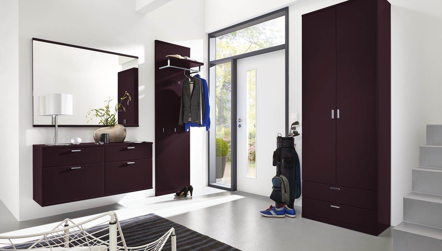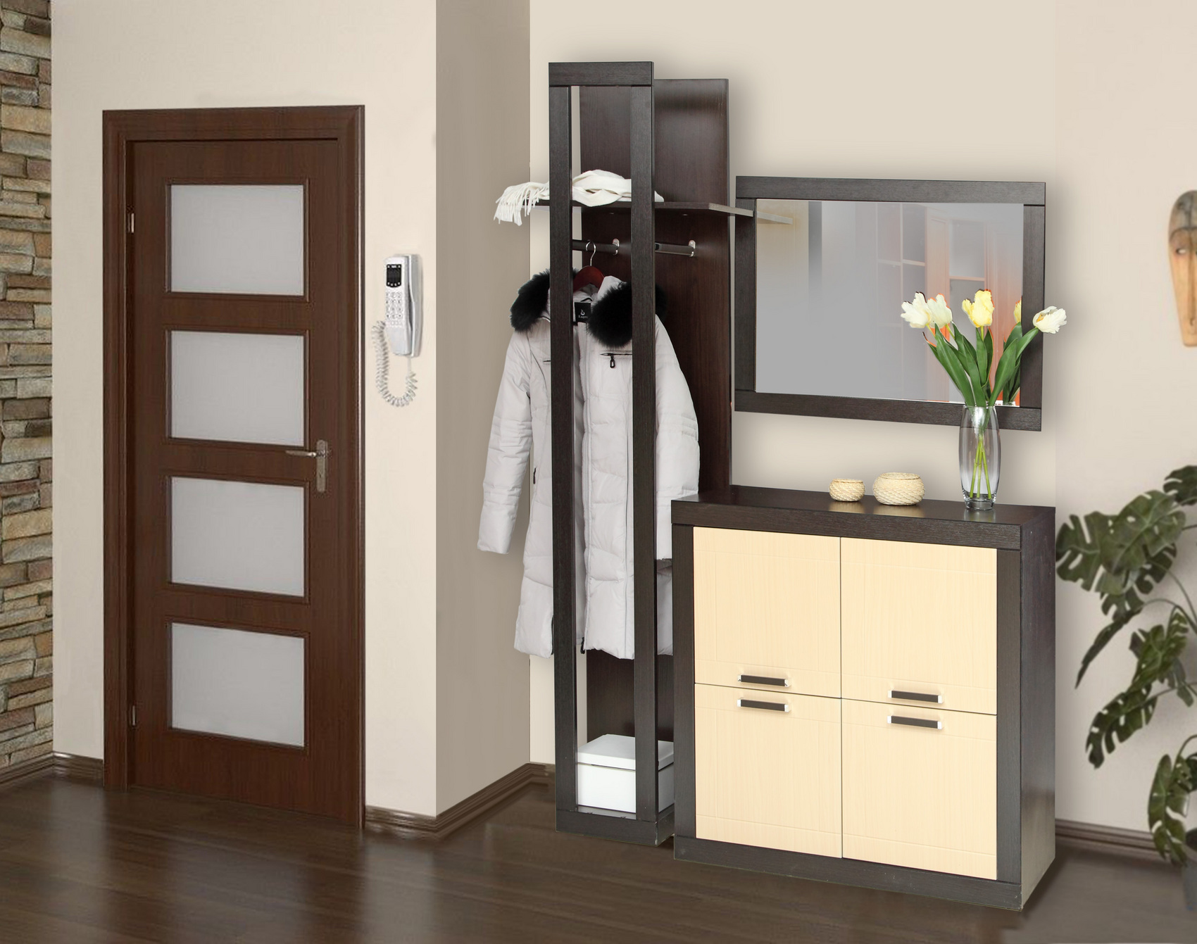 - kann alle notwendigen Elemente halten - Kleiderbügel, Haken, Kästen für kleine Dinge, Regale für Schuhe;