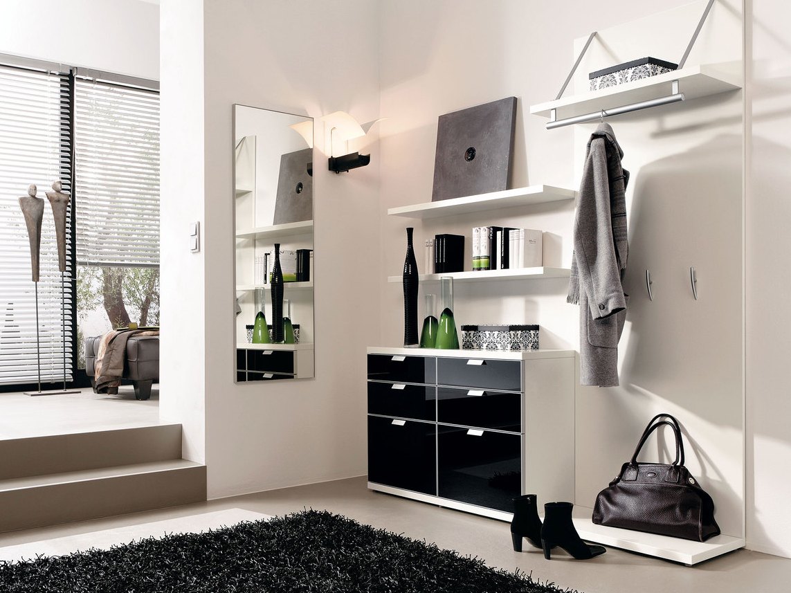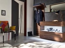 - Regale für Taschen und anderes Zubehör befinden sich normalerweise über dem Kleiderständer. Side-Kabinett kann mit Eckregalen ergänzt werden, wo bequem das Telefon, Modem und andere Kleinigkeiten bekommen. Schuhe können am Boden des Schranks oder in einem speziellen Schrank aufbewahrt werden.
