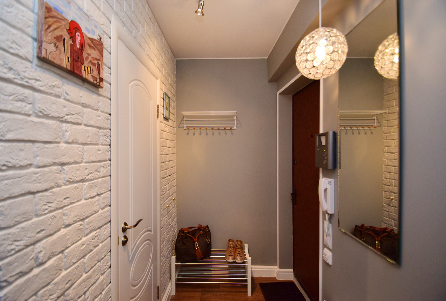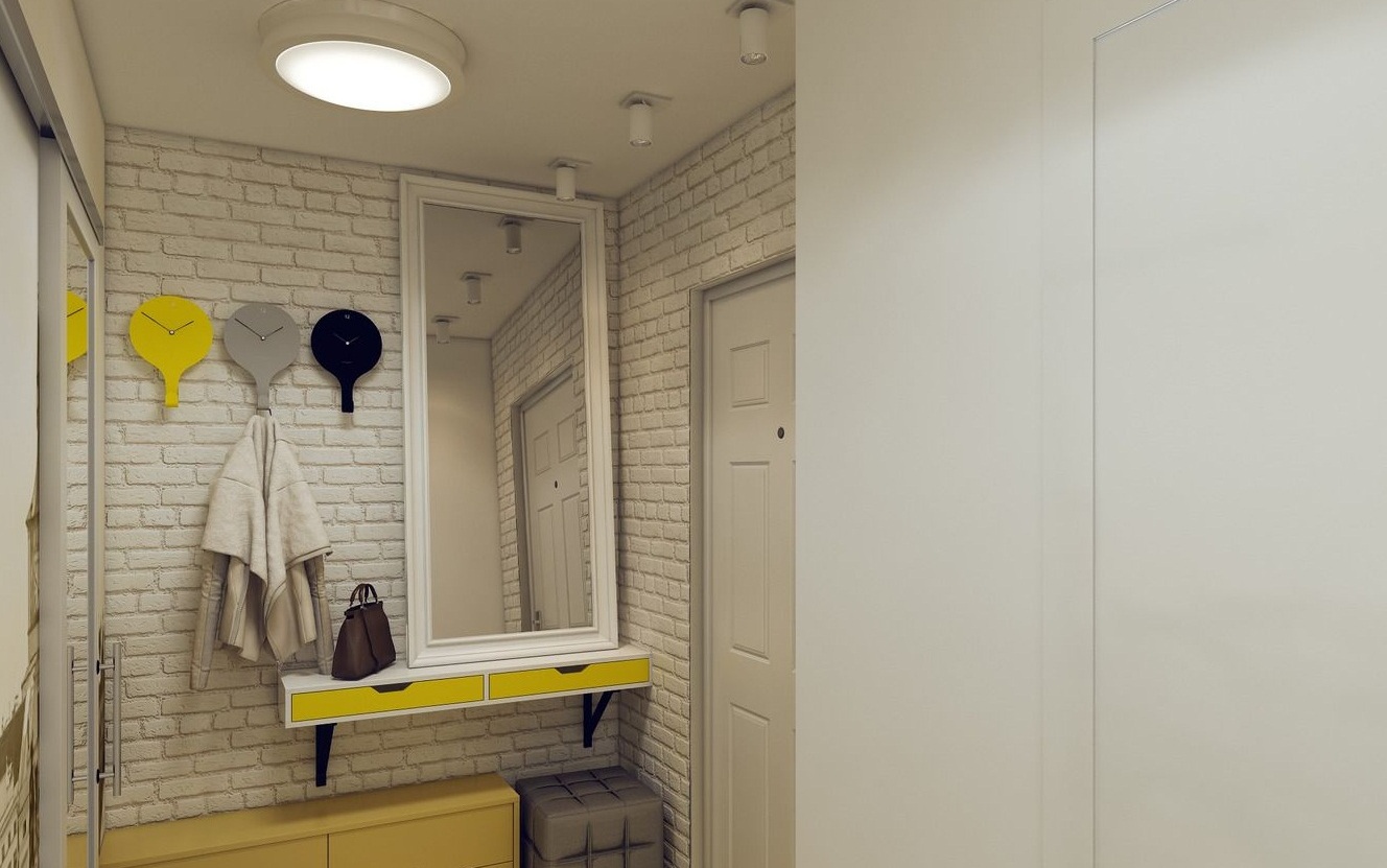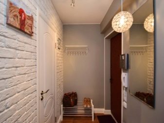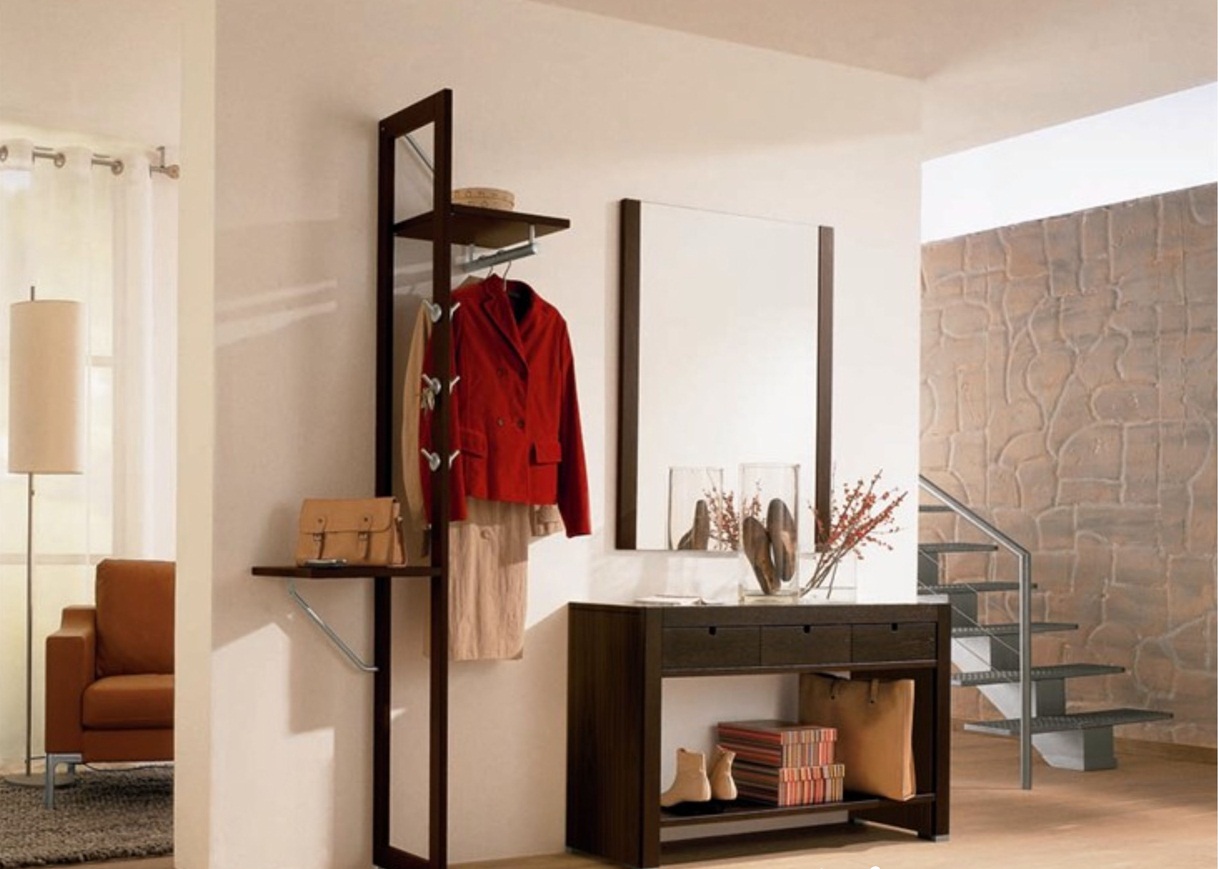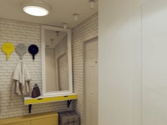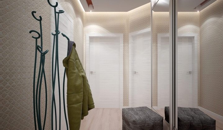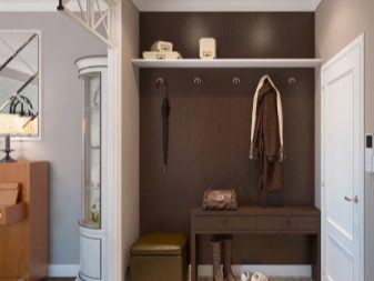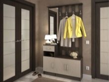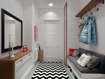 Diese Art von Flur erreicht man bei begrenzten Platzverhältnissen oder wenn die Mieter in der Wohnung sind wenige und es gibt keine Notwendigkeit, viele Dinge zu speichern. Jede Option beinhaltet ein Minimum an Möbeln.Normalerweise ist es eine Platte mit Haken oder einem vertikalen Aufhänger, Ständer und Spiegel. Ohne einen Schrank können Sie darauf verzichten oder ein kleines schmales Modell aufheben.