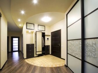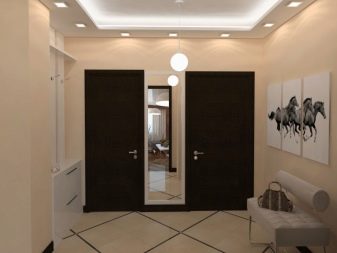 Der Raum dieser Form ist einfach zu gestalten und zu dekorieren.In diesem Raum können Sie die Spotbeleuchtung zugunsten des Kronleuchters deaktivieren. Es ist jedoch wichtig, sich daran zu erinnern Glühbirnen mit herunterhängenden Elementen passen in den Flur mit einer hohen Decke. Wenn der Raum diese Eigenschaft nicht hat, dann bevorzugen Sie ein einfacheres Design.