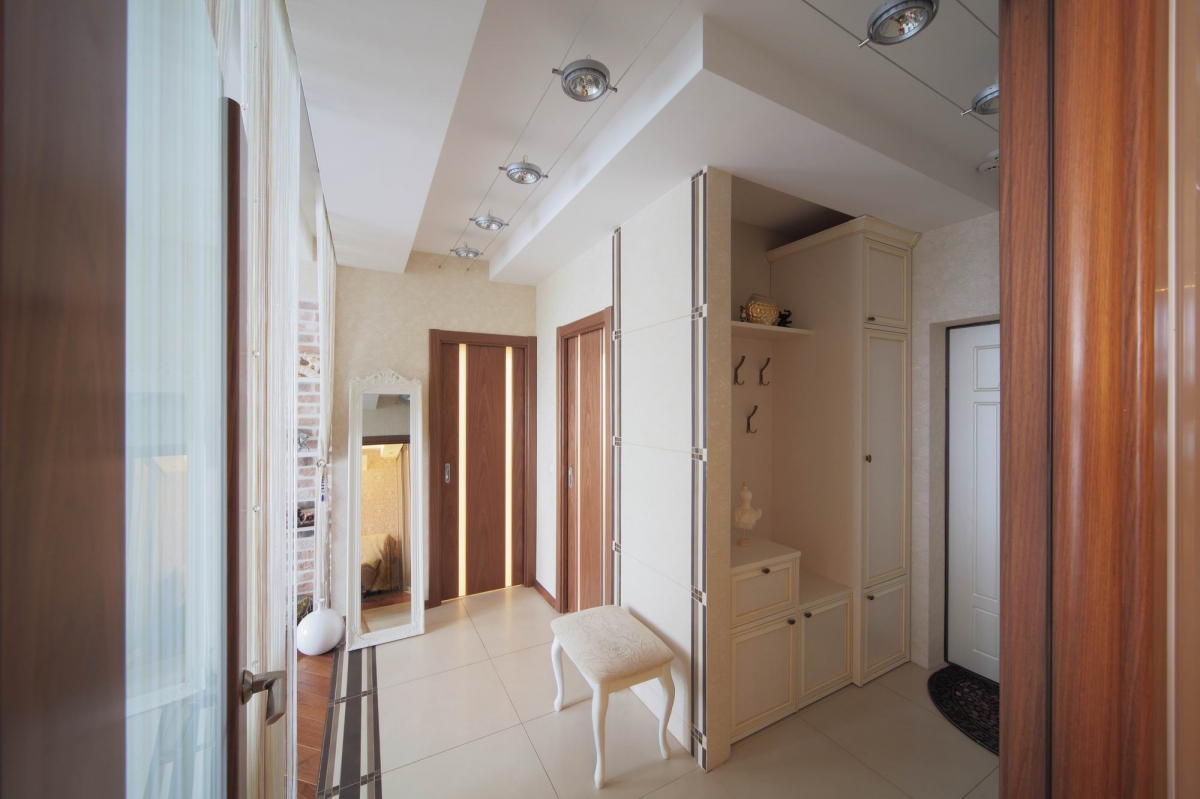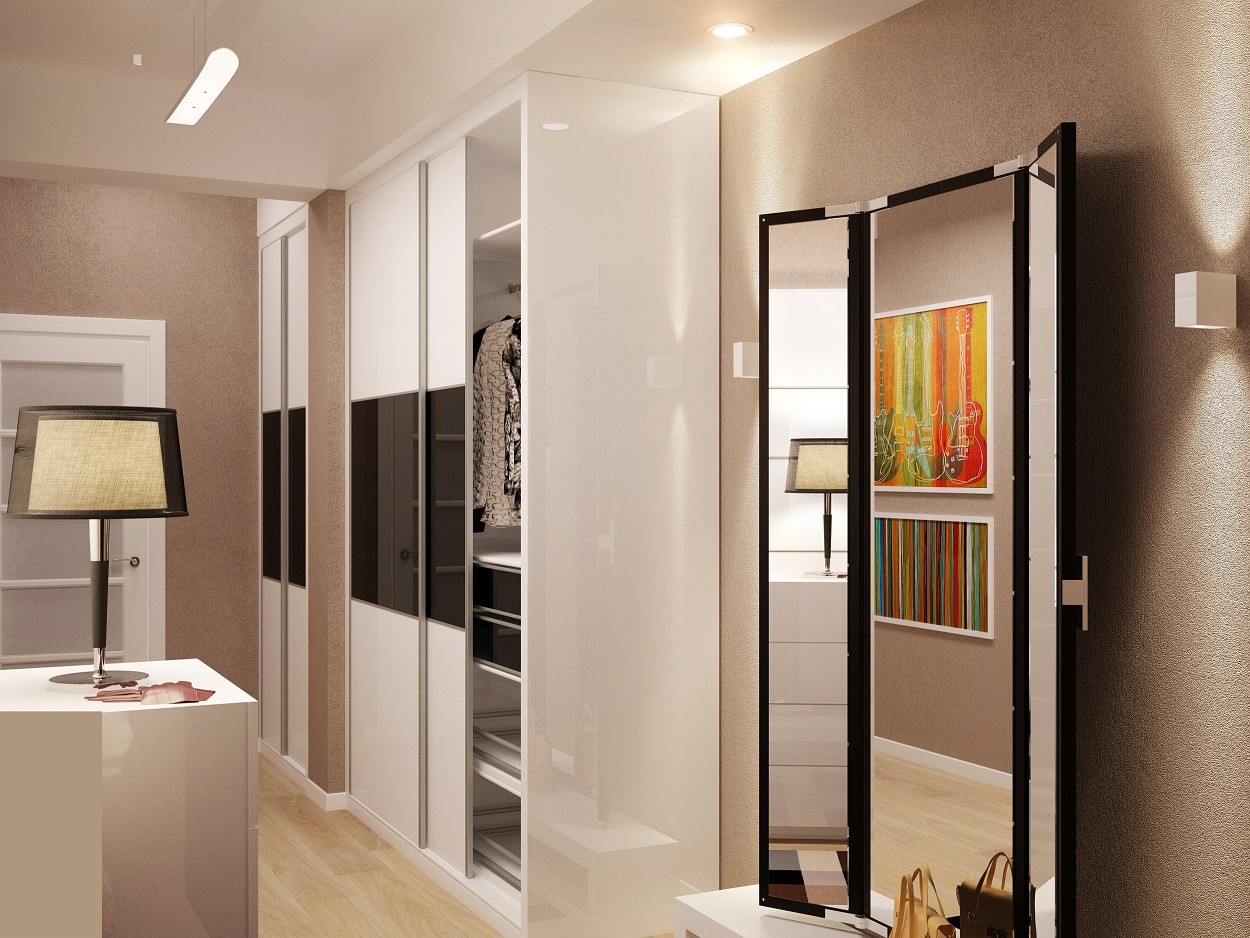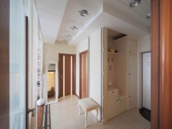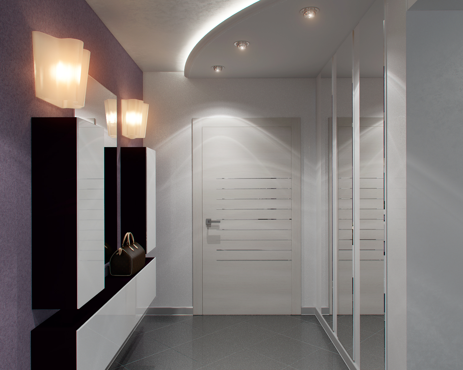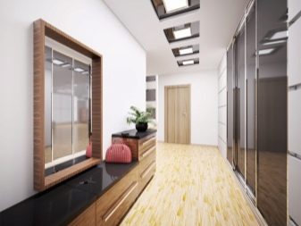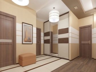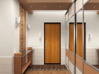 Bei der Gestaltung eines schmalen Korridors passen helle Pastellfarben - sie erweitern optisch den Abstand zwischen den Wänden. Helle Farben sind ziemlich gebrandet, also achte auf die Sorgfalt, die dieses oder jenes Material braucht. Passt perfekt in diese Layout-Garderobe mit Spiegeltüren. Versuchen Sie, die Form des Korridors visuell auf den Platz zu bringen. Zum Beispiel können Sie einen Teil des Korridors mit einem geräumigen Kleiderschrank abschneiden. In diesem Fall wird sein Anfang geräumiger aussehen.