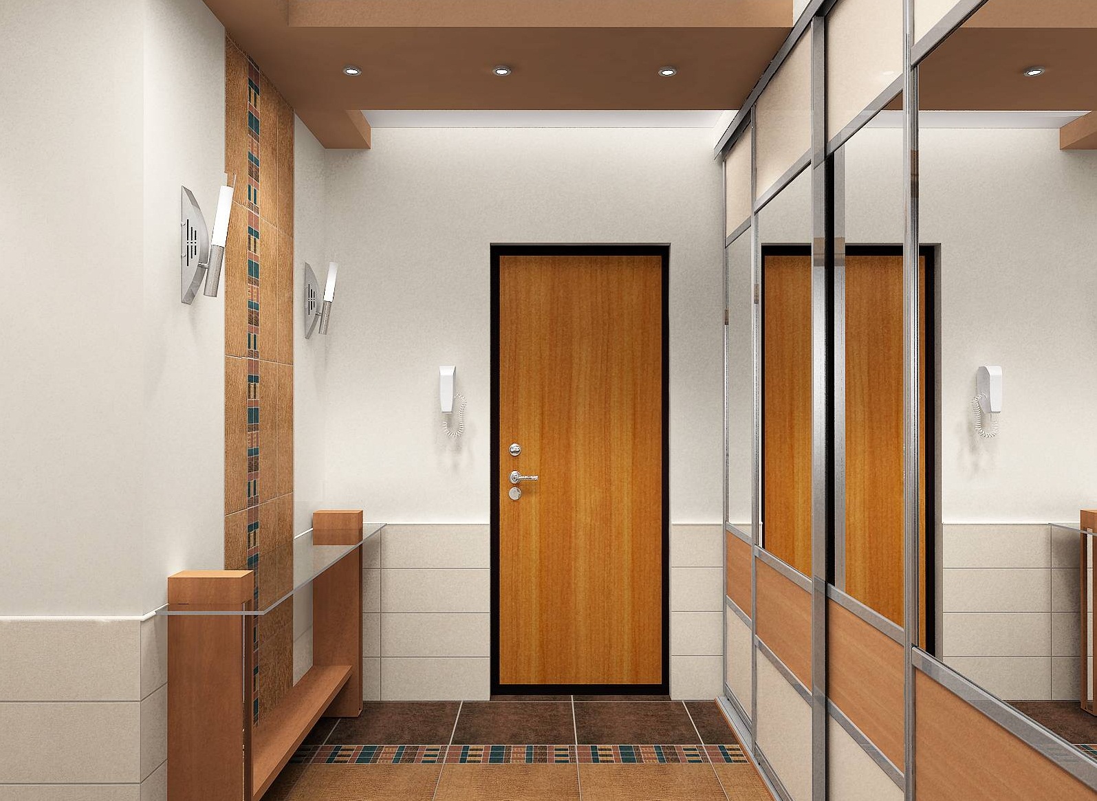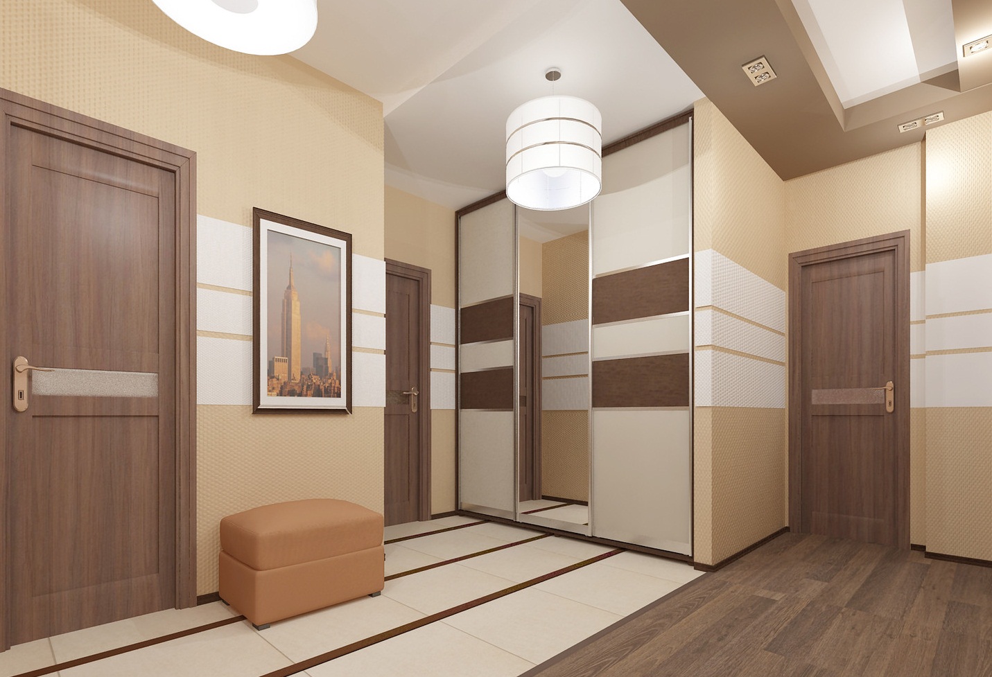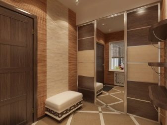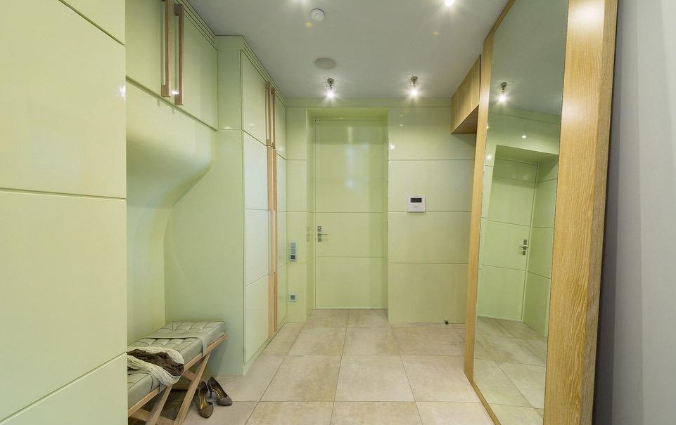Bei der Gestaltung eines schmalen Korridors passen helle Pastellfarben - sie erweitern optisch den Abstand zwischen den Wänden. Helle Farben sind ziemlich gebrandet, also achte auf die Sorgfalt, die dieses oder jenes Material braucht. Passt perfekt in diese Layout-Garderobe mit Spiegeltüren. Versuchen Sie, die Form des Korridors visuell auf den Platz zu bringen. Zum Beispiel können Sie einen Teil des Korridors mit einem geräumigen Kleiderschrank abschneiden. In diesem Fall wird sein Anfang geräumiger aussehen.